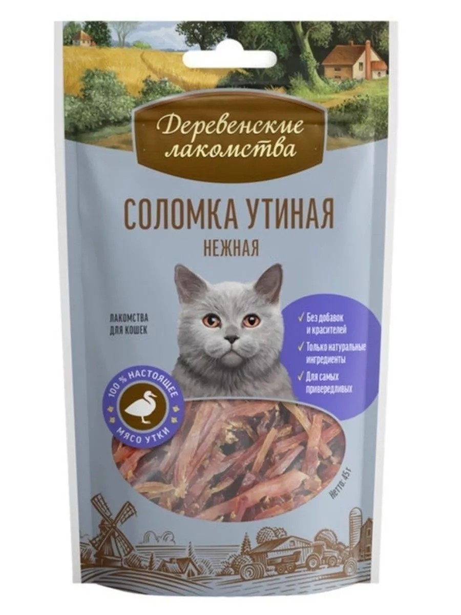 Деревенские лакомства соломка утиная нежная для кошек - 50 г 1 упаковка. Нашу нежную утиную соломку можно использовать как отдельное лакомство, а можно добавлять в основной корм. Попробуйте — от такого корма не откажется никто! Гарантированные показатели на 100 г продукта: белок — 40,9 г, жир — 2,77 г, влага — 23 г, клетчатка — 0,39 г; энергетическая ценность — 204,5 ккал.
