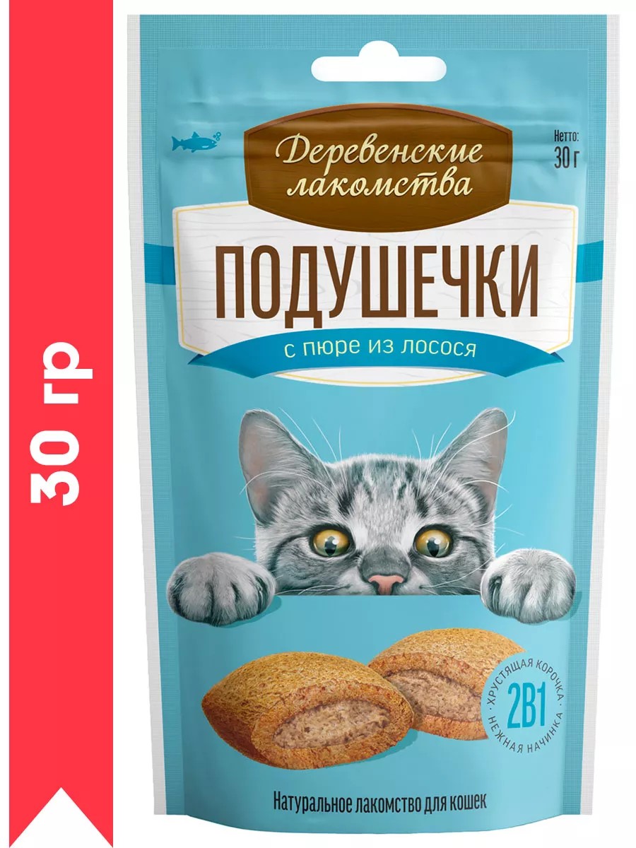 Хрустящие подушечки для кошек с нежной начинкой из натурального лососевого пюре. Ключевые особенности:Хрустящие подушечки с нежной начинкой.Из отборного мяса.С витаминами и минералами.Для поддержания здоровья зубов.Без красителей и ароматизаторов.В удобной упаковке. Какая кошка откажется от аппетитного лакомства? Особенно если речь идет о хрустящих подушечках ДЕРЕВЕНСКИЕ ЛАКОМСТВА с начинкой из нежнейшего пюре. Великолепная комбинация из хрустящей корочки и нежнейшего натурального пюре сделают это лакомство любимым угощением Вашей кошки. Уникальная пористая структура лакомства помогает поддерживать гигиену ротовой полости животного. Удобная упаковка с zip-застежкой поможет дольше сохранить свежесть лакомства. Подушечки с пюре из лосося не оставят ни одну кошку равнодушной! Состав:Злаки, белок растительный, лосось, яичный желток, мука рыбная, молотая креветка, растительное масло, картофель, кошачья мята, фрукты и овощи (семена граната, клюква).