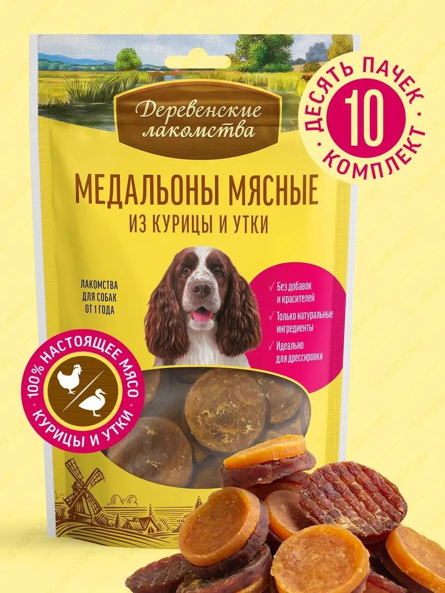 | Комплектация | Лакомство для собак "Деревенские лакомства" медальоны мясные из курицы и утки |