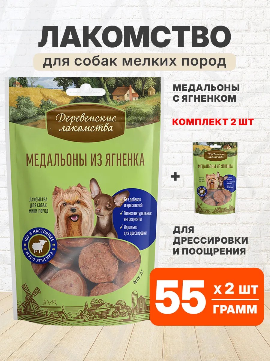 | Комплектация | Лакомства деревенские для собак мелких пород медальоны ягненок 55 гр - 2 шт |