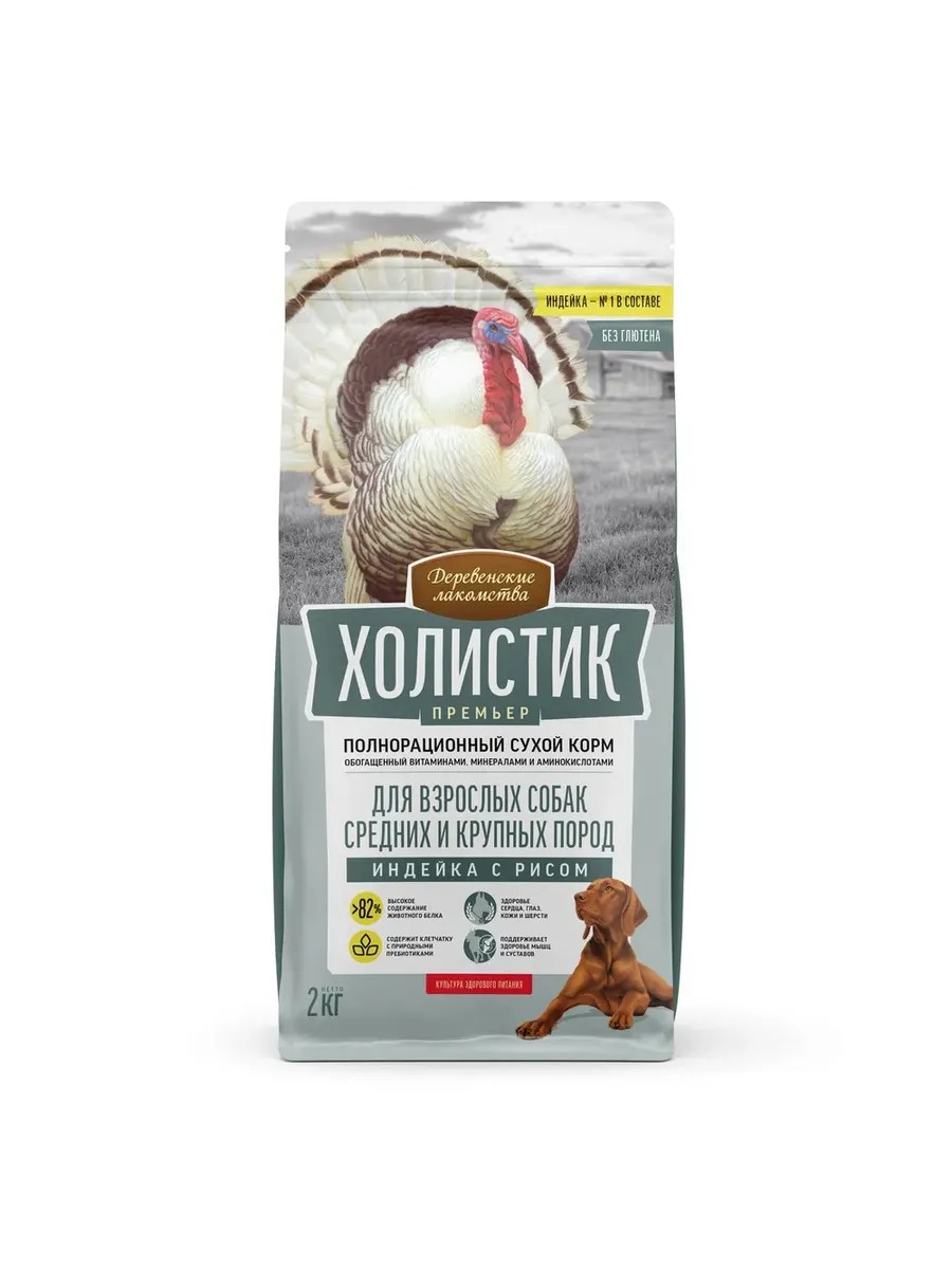 Деревенские лакомства. Полнорационный сухой корм для взрослых собак средних и крупных пород индейка с рисом, 2кг. Здоровье и долголетие являются основными приоритетами в рецептурах кормов «Холистик премьер». Именно поэтому основой наших кормов является настоящее мясо — источник высококачественного белка. Все рецепты обогащены глюкозамином и хондроитином — для здоровья костей и суставов; омега-жирными кислотами и пребиотическими волокнами — для поддержки желудочно-кишечного тракта, крепкой иммунной системы и идеального состояния кожи и шерсти.