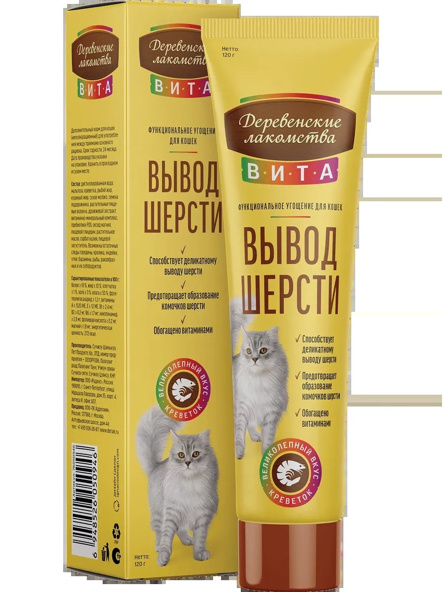 Функциональная паста Вита. Вывод шерсти со вкусом креветки является незаменимым помощником в заботе о благополучии вашей кошки. Её уникальная формула помогает деликатно выводить комочки шерсти, накапливающиеся в пищеварительном тракте и при регулярном приеме способствует эффективному предотвращению появления новых комочков. Каждая порция пасты обогащена витаминами и минералами. Вкус креветки добавляет пасте привлекательности, что делает ее прием не только полезным, но и приятным времяпрепровождением для вашего питомца. Состав: дистилированная вода, мальтоза, креветка, рыбий жир, куриный жир, сухое молоко,семена подорожника, растительные пищевые волокна, дрожжевой экстракт, витаминно-минеральный комплекс, пребиотики FOS, оксид магния, пищевой глицерин, растительное масло,сорбат калия, пищевой загуститель.