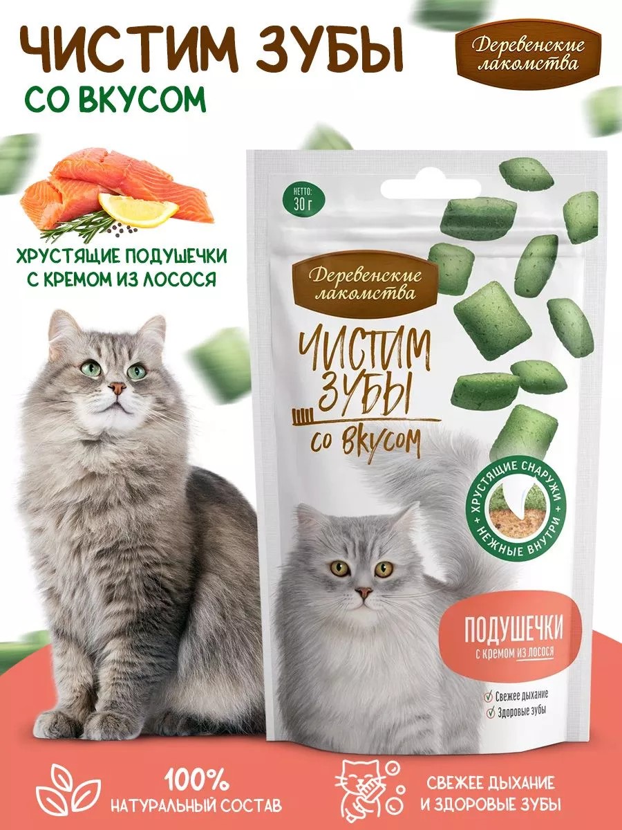 Хрустящих подушечки для кошек "Чистим зубы", благодаря своей пористой структуре, удаляют зубной налет, предотвращают образование зубного камня и освежают дыхание. Начинка из нежного мясного крема делает их любимым угощением кошек. Теперь чистить зубы не только просто, но и вкусно! Дополнительный корм для питомцев (неполнорационный) для употребления между приемами основного рациона.