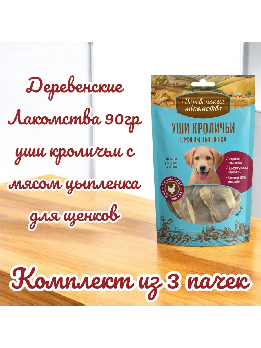 Деревенские лакомства Уши кроличьи с мясом цыпленка для щенков 90г, 3 пачки