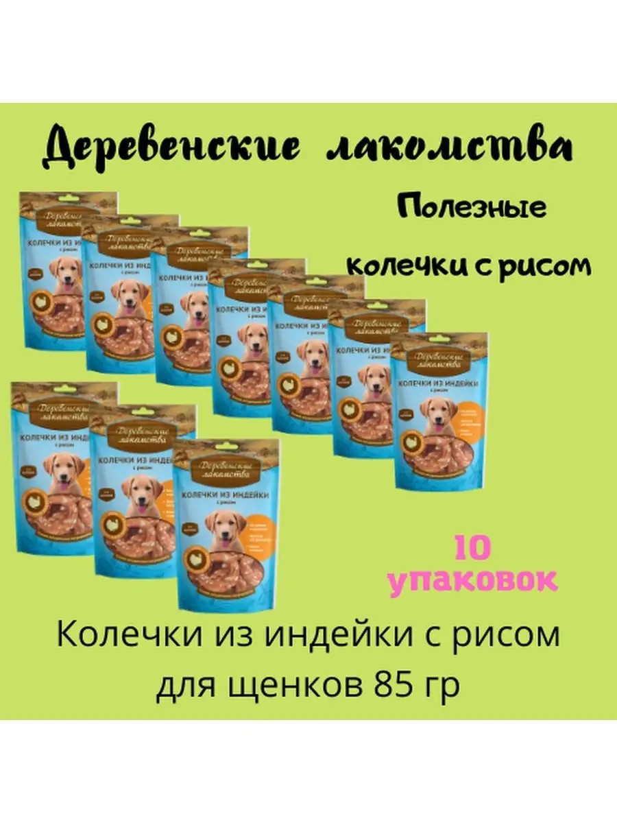 | Комплектация | Деревенские лакомства 0,085кг колечки из индейки с рисом для щенков; Комплект из 10-и упаковок |