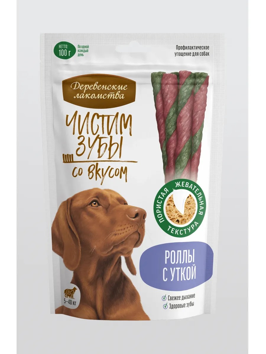 Лакомство деревенские вкусняшки "Ролл с уткой" для собак всех пород, вес 100 грамм. Долгоиграющее лакомство выполняет сразу две цели. Позволяет собаке полакомиться вкусным мясом и одновременно грызть ролл и чистить зубы. Жевательная палочка эффективно удаляет налет и зубной камень, позволяя производить гигиену и поддерживать здоровье зубов. Освежает дыхание, способствует профилактике кариеса. Мясное собачье угощение предназначено для чистки зубов собак всех пород. При помощи ролла можно поощрить собаку за примерное поведение, поднять настроение любимому питомцу, использовать его как поощрение награду для дрессировки. Палочка зубочистка изготовлена из натуральных ингредиентов отборного качества. В составе эко погрызушки натуральная утка, курица, говяжий жир, субпродукты растительного происхождения. Зоотовары, эколакомство обогащено минералами, укрепляющими зубы собаки. В составе нет вредных химических добавок, красителей и консервантов. Только натуральные растительные и животные ингредиенты. А изумительный вкус еды мясоешки понравится даже самой требовательной собачке. Товары для собак, жевательные палочки грызуны рекомендуется давать собакам по одной в день в дополнение к основному корму. Долгоиграющее угощение поможет чистить зубы быстро, легко и эффективно! Подходит для молодых и для пожилых собак.