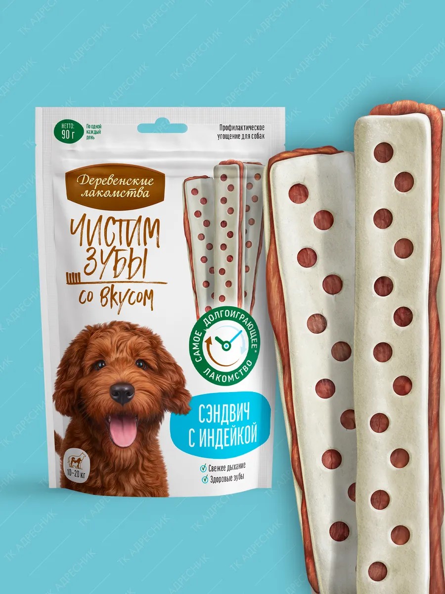 The super-chewable Turkey Sandwich treat effectively removes plaque and prevents tartar buildup. The meat filling is made from select turkey fillet and contains no artificial preservatives or colors. Now brushing teeth is not only easy but also delicious! This treat is designed for adult dogs of all breeds. It will provide your pet with fresh breath and healthy teeth. Ingredients: chicken, turkey, rawhide, vegetable by-products, minerals. May contain traces of: duck, lamb, rabbit, fish, crustaceans, and their by-products.