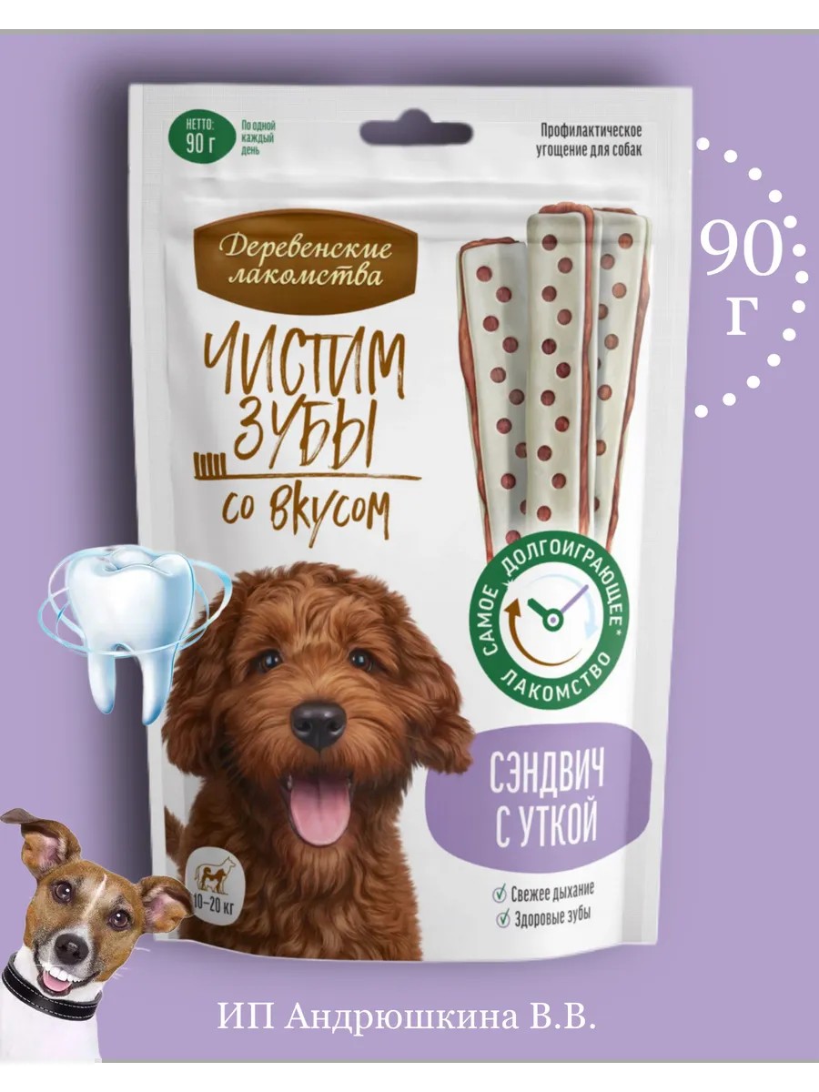 Супер-жевательное лакомство «Сэндвич с уткой» эффективно удаляет зубной налёт, предотвращая образование зубного камня. Мясная начинка приготовлена из отборного филе утки и не содержит искусственных консервантов и красителей. Теперь чистить зубы не только просто, но и вкусно!