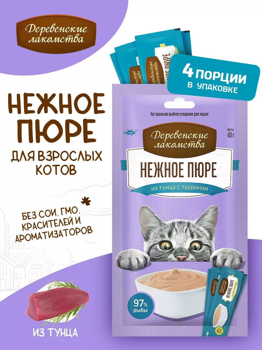 КомплектацияДеревенские лакомства для кошек Нежное пюре из тунца