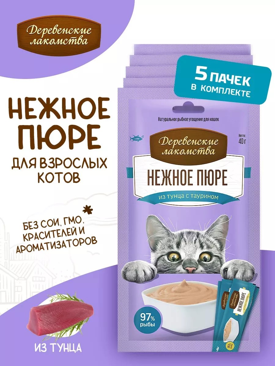 КомплектацияДеревенские лакомства для кошек Нежное пюре из тунца