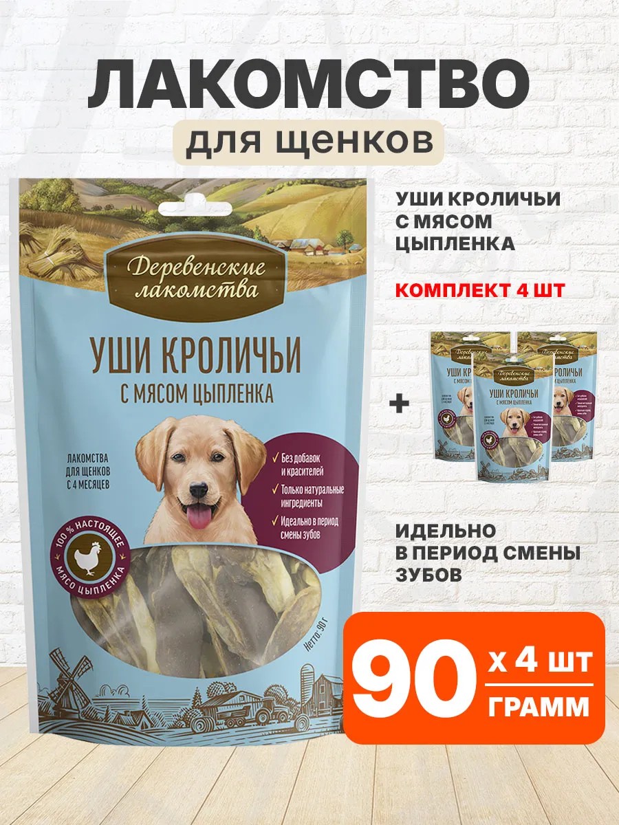 | Комплектация | Лакомства деревенские уши кролика с куриным мясом для щенков 90 гр - 4 шт |