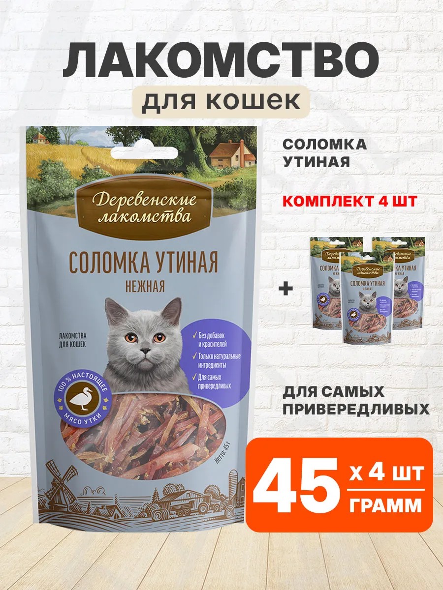 | Комплектация | Лакомства деревенские для кошек нарезка из нежного мяса утки 45 гр - 4 шт |