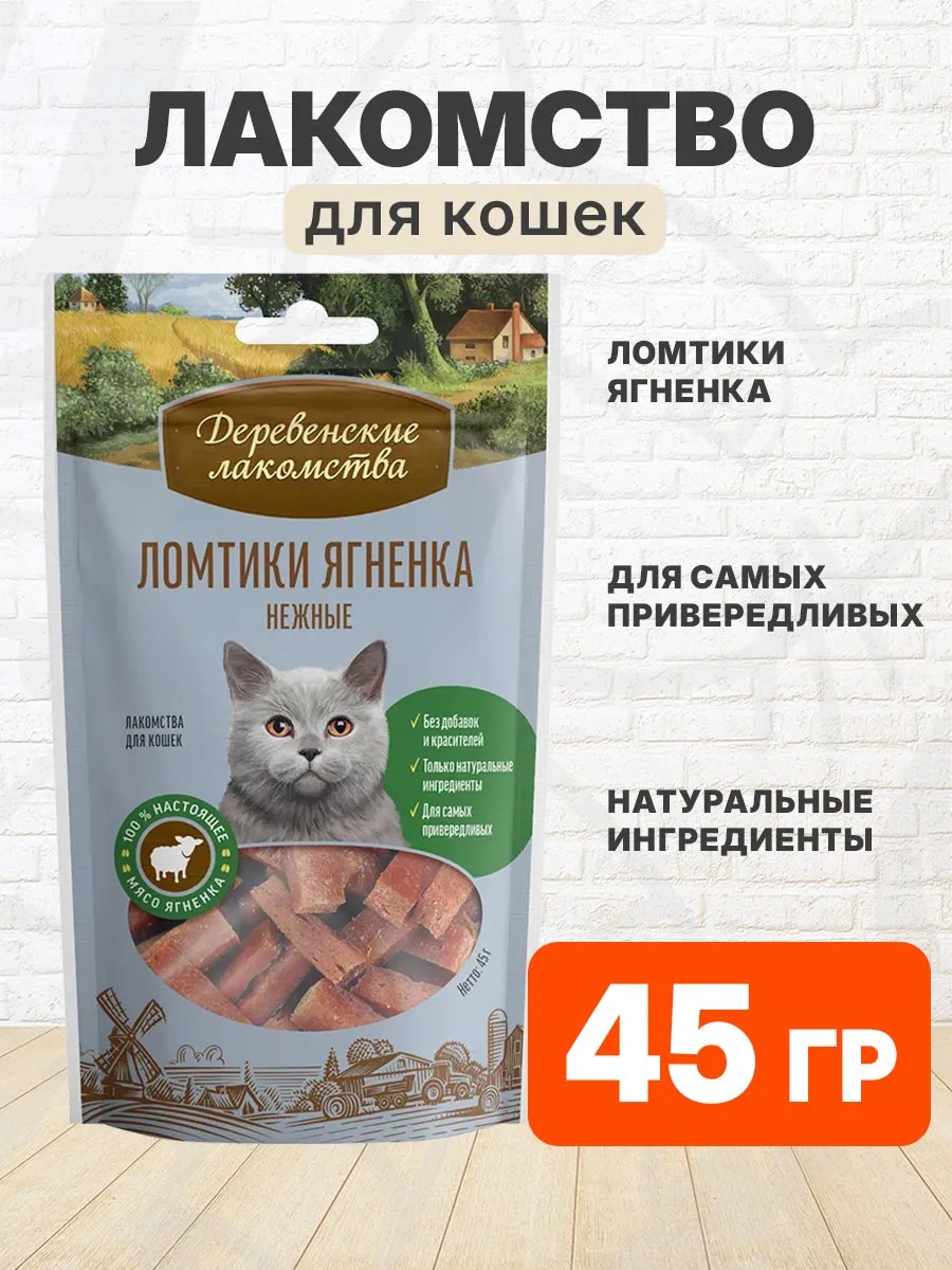 | Комплектация | Лакомства деревенские ломтики из мяса ягненка для кошек 45 гр - 1 шт |