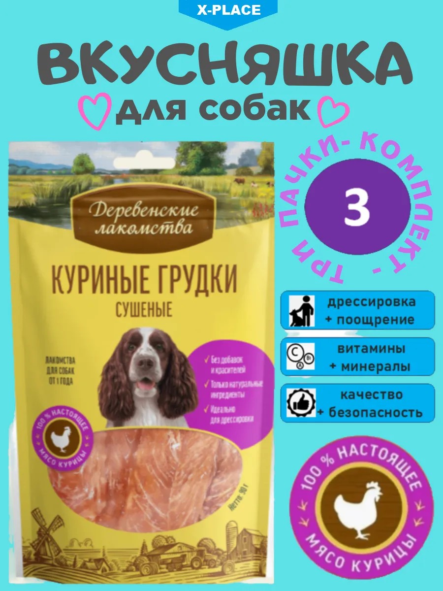 Удивите своего любимого питомца вкусняшкой "Куриные грудки сушеные" Деревенские лакомства. В одной упаковке 3 шт по 90 г. Это полезные лакомства, обогащенные витаминами и менералами для собак мелких и средних пород.
