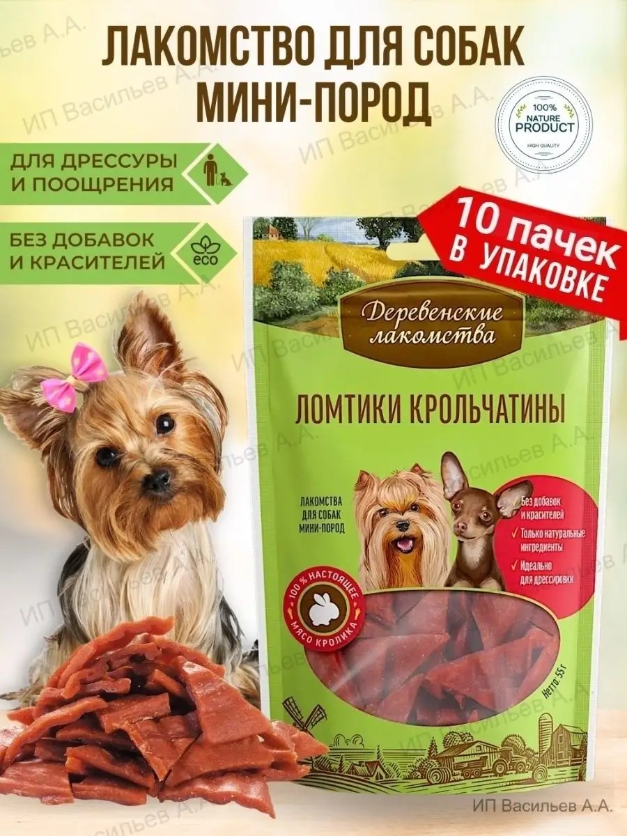 Ломтики крольчатины бренда Деревенские лакомства лучшее угощение для собак. Они созданы на основе натуральных, тщательно отобранных компонентов, богаты витаминами и минералами, необходимыми для поддержания здоровья и активного роста домашних животных. В набор входят маленькиеломтики из кролика. Можно приобрести как 1 пачку, так и упаковки из 4, 5 и 10 пакетиков. При их изготовлении использовалось свежее мясо кролика. Кроме того, в составе есть сыромятная говяжья кожа и субпродукты растительного происхождения. Эти съедобные вкусности в виде сушеных долгоиграющих палочек можно использовать в качестве самостоятельного угощения между привычным приемом пищи. Эти вещи способны выступить отличным средством для ухода за пастью и очистки от зубного налета. В них содержатся белки, жиры и углеводы в оптимальных долях, обогащенные кальцием, который крайне важен для формирования скелета и нормального функционирования опорно-двигательного аппарата. Тщательно подобранная формула разработана с учетом норм ветеринарии. Продукция не вызывает аллергии, обеспечивает эффективную профилактику кариеса и воспаления десен. Эти зоотовары настоящий деликатес, содержащий комплекс полезных веществ для собачьего здоровья. Сушеный десерт положительно отражается на состоянии кожи, способствует выведению токсинов и удовлетворению жевательных инстинктов. Пищевой продукт подходит для кормления любой собачки малых и средних, больших размеров. Это идеальное дополнение рациона питания. Его можно использовать для воспитания и дрессировки. С такими лакомствами приучить питомца выполнять команды будет намного проще. Они не вызывают сложностей в хранении и могут выступить отличной подарочной идеей. У нас есть акции и распродажи, вы можете купить наши товары в подарок со скидкой!