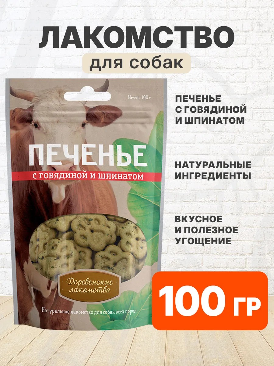 Лакомства ДЕРЕВЕНСКИЕ для собак печенье с говядиной и шпинатом 100 гр. Печенье с говядиной и шпинатом – Деревенские Лакомства всегда кстати!Сбалансированный состав этого печенья позволяет рекомендовать их в качестве ежедневного угощения всем без исключения!