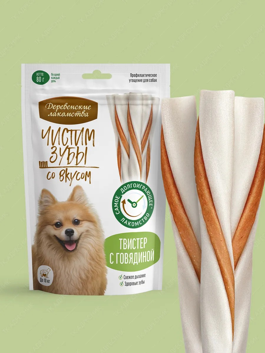 Деревенские лакомства Твистер д собак до 10кг Чистим зубы, говядина 80г