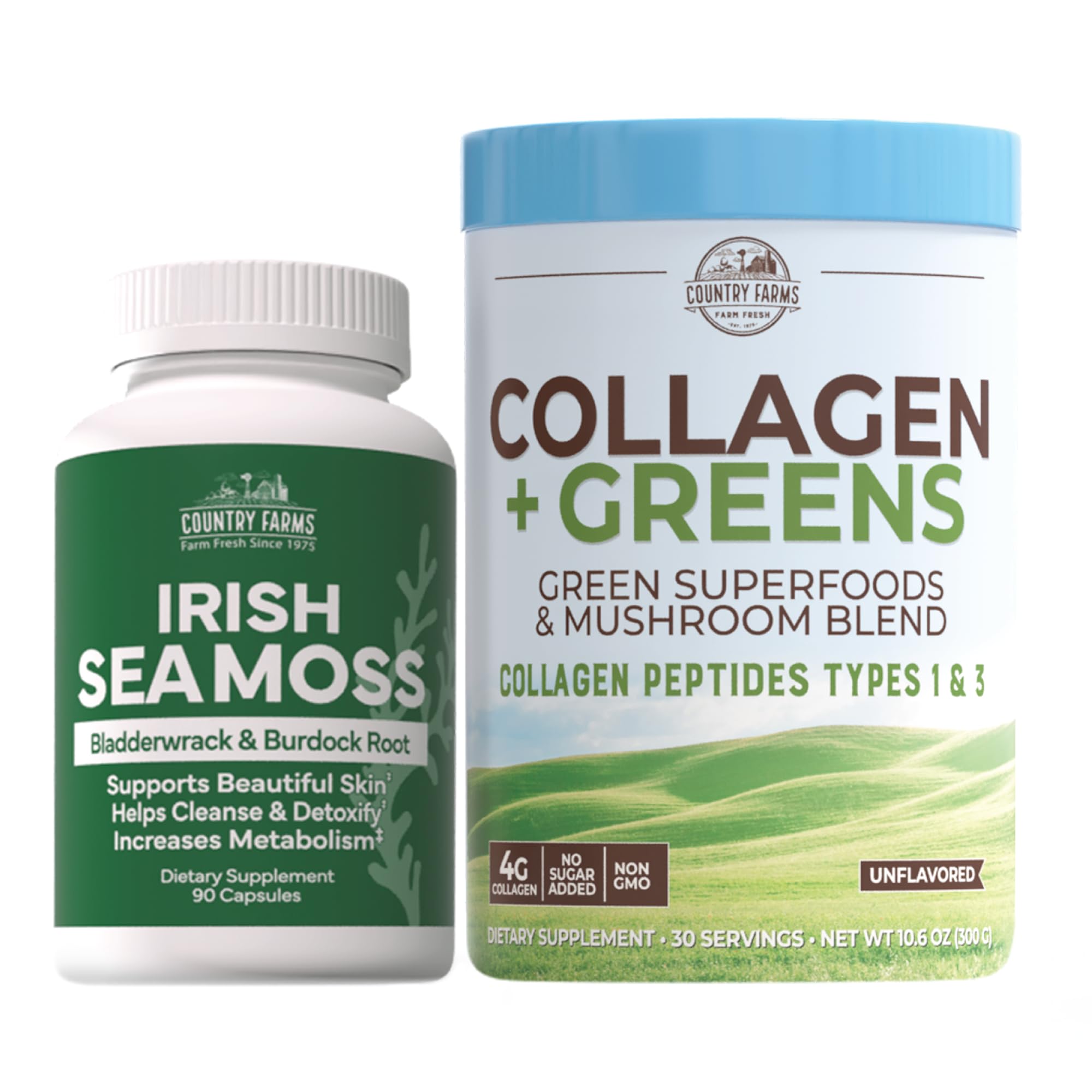 Discover the synergy of beauty and wellness within our Country Farms Collagen Greens Powder and Country Farm Irish Sea Moss Capsules. Unleash the youthful radiance blend of Collagen and Sea Moss, elevating your beauty from within. While Collagen works its magic on your skin, hair, and nails, Irish Sea Moss promotes a nutrient-dense boost. This marine superfood enriches your skin's natural glow and fortifies your hair structure, exuding resilience, and vitality. The duo's power extends beyond mere beauty it caters to your skin's hydration and elasticity. The Sea Moss enhances hydration, while Collagen improves skin elasticity, creating a comprehensive solution for supple, beautiful skin. To optimize their effects, embrace both elements daily—begin your mornings with the energizing Collagen Greens Powder and seamlessly pair it with the Irish Sea Moss Capsules. This dynamic combination nurtures skin, hair, and nails, providing comprehensive nourishment and holistic wellness support.FOR OPTIMAL RESULTS TAKE BOTH. Energize your mornings by incorporating Country Farms Collagen Greens Powder into your routine. These powerful greens blend is packed with collagen for optimal support and can be seamlessly paired with Irish Sea Moss Capsules to start your day, providing a potent combination of skin, hair and nail nourishment and overall wellness support. HYDRATION AND ELASTICITY. The Sea Moss in this pack enhances skin hydration, maintaining a youthful appearance. Combined with collagen's ability to improve skin elasticity, this duo provides a comprehensive solution for achieving and maintaining beautiful, supple skin. HAIR RESILIENCE BOOST. Elevate your hair game with Country Farms Collagen Greens max strength and Country Farms Irish Sea Moss's nutritional bounty. This combination fortifies hair structure, promoting resilience and vitality. Embrace healthier, shinier locks that exude beauty and confidence. NUTRIENT-DENSE IRISH SEA MOSS. Country Farms Irish Sea Moss Capsules are rich in minerals, and antioxidants and complement Collagen Greens benefits. This marine superfood supports a healthy skin barrier and contributes to a natural glow by nourishing from within. Together, they create a beauty matrix that nurtures skin, promoting a vibrant and rejuvenated look. YOUTHFUL RADIANCE BLEND. Unleash the power of Country Farms Collagen Greens Powder and Country Farms Irish Sea Moss Capsules to enhance your beauty from within. Collagen revitalizes skin, hair, and nails, while Irish Sea Moss provides a nutritional boost for a radiant and youthful complexion.