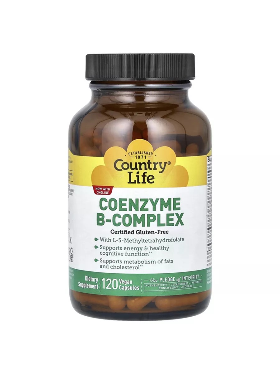 Коферментный комплекс витаминов группы B от Country Life содержит незаменимые витамины группы B в их активной «коферментной» форме. Этот комплекс известен и популярен в течение вот уже более 15 лет. Он содержит метилфолат — одну из наиболее активных форм фолата, доступных на сегодняшний день. Кроме того, у продукта нет характерного для витамина B вкуса и запаха. Теперь с холином — незаменимым питательным веществом, необходимым для образования ацетилхолина, важного нейромедиатора.