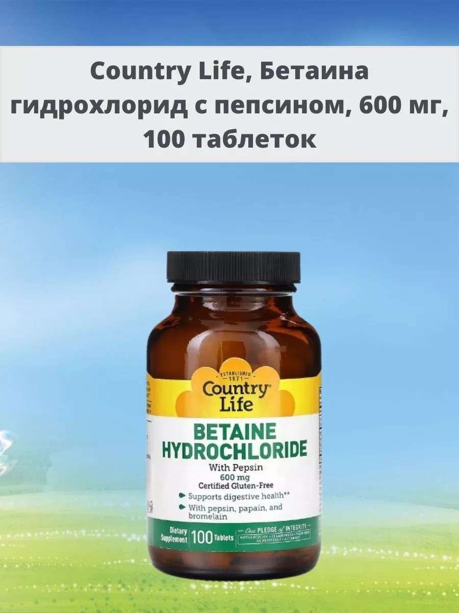 Country Life Бетаина гидрохлорид с пепсином 600 мг 100 таблеток