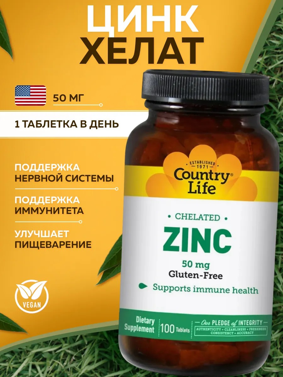 Country Life Цинк хелат(chelated zinc), 50 мг, 100 таблеток