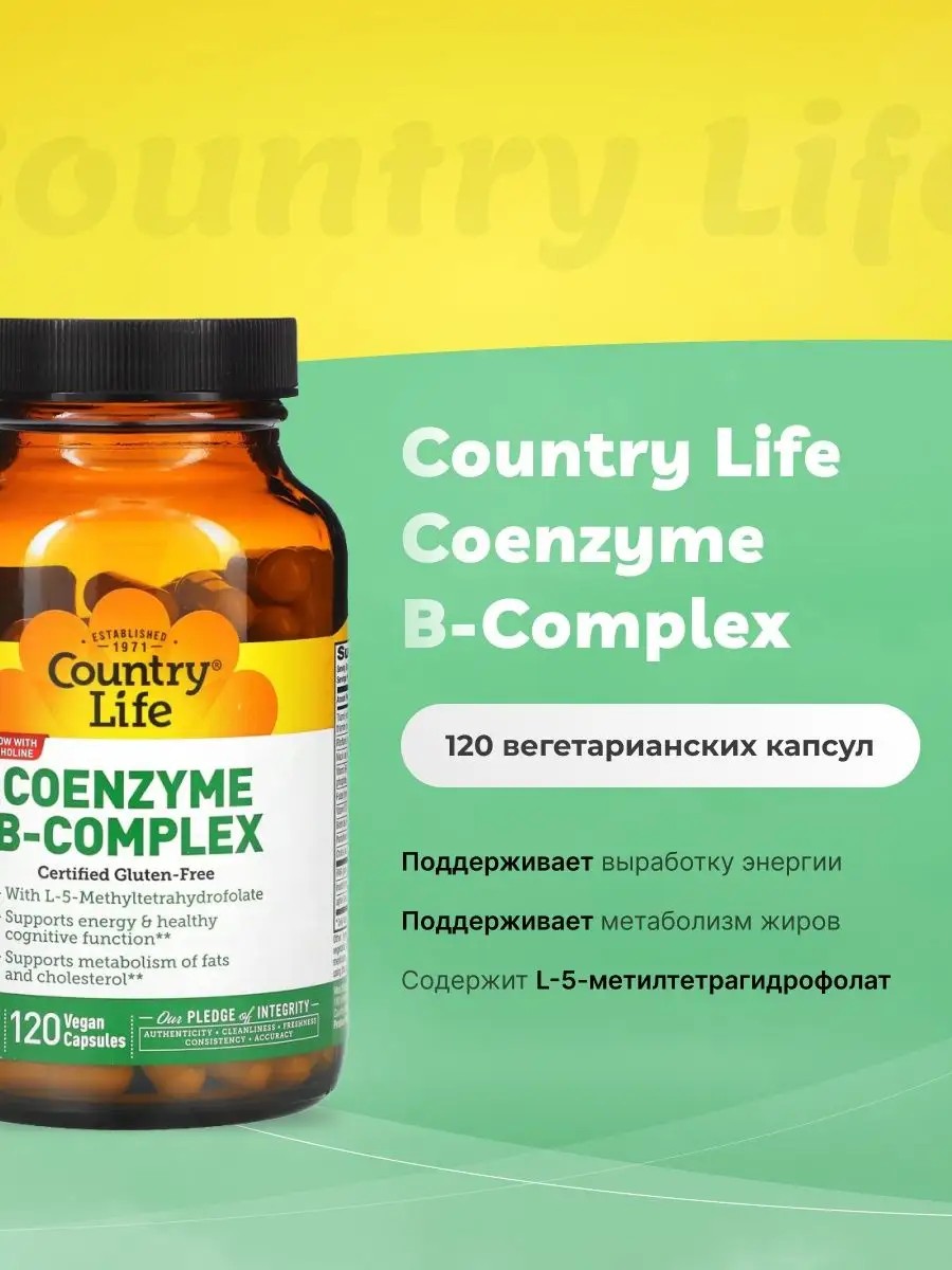 Country Life Coenzyme B-Complex идеально подходит для людей, которые хотят поддерживать свое здоровье и энергию на высоком уровне. Этот продукт не содержит глютена, сои, молочных продуктов и искусственных красителей, а также подходит для веганов и вегетарианцев.