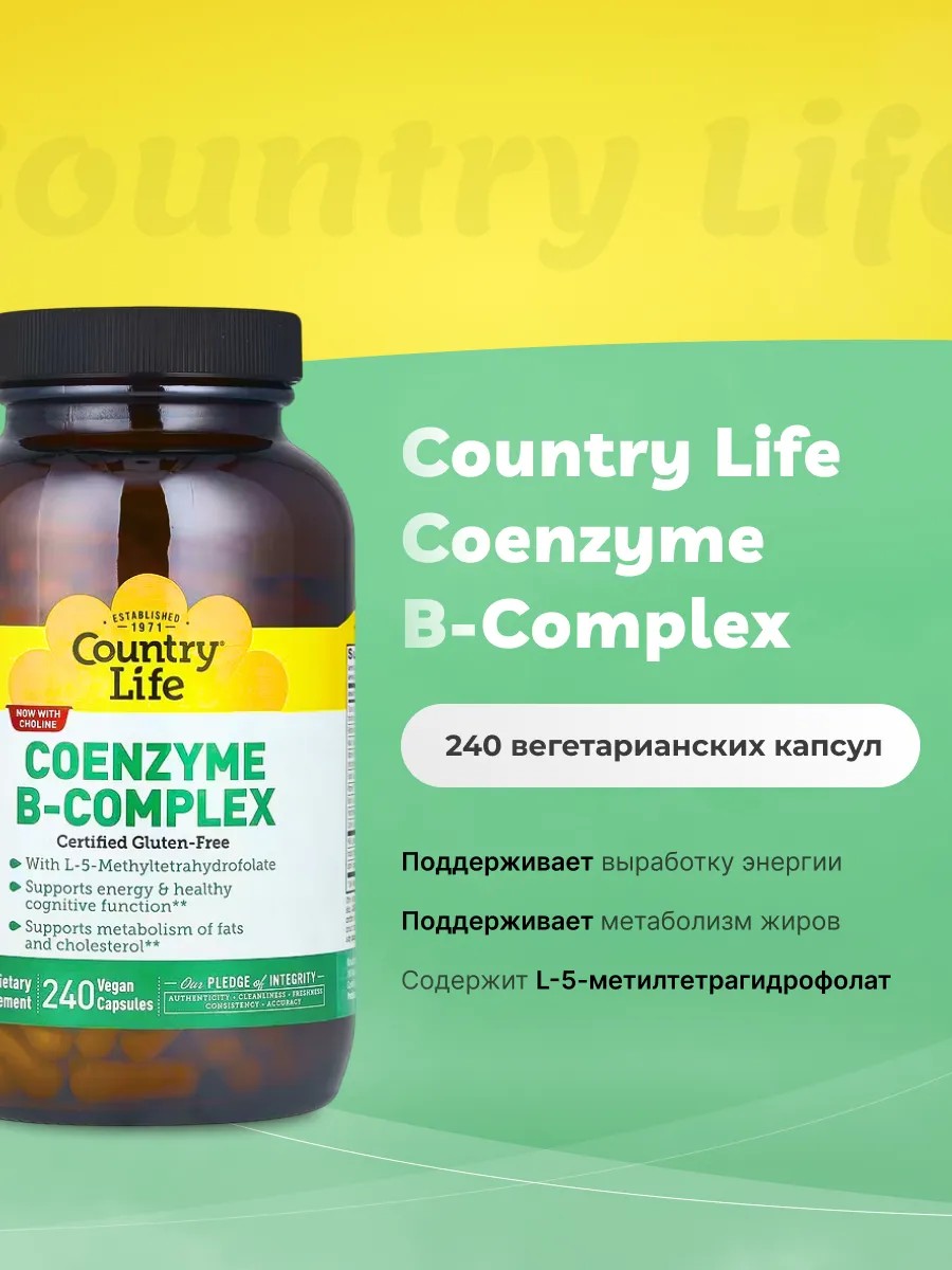 Country Life Coenzyme B-Complex идеально подходит для людей, которые хотят поддерживать свое здоровье и энергию на высоком уровне. Этот продукт не содержит глютена, сои, молочных продуктов и искусственных красителей, а также подходит для веганов и вегетарианцев.