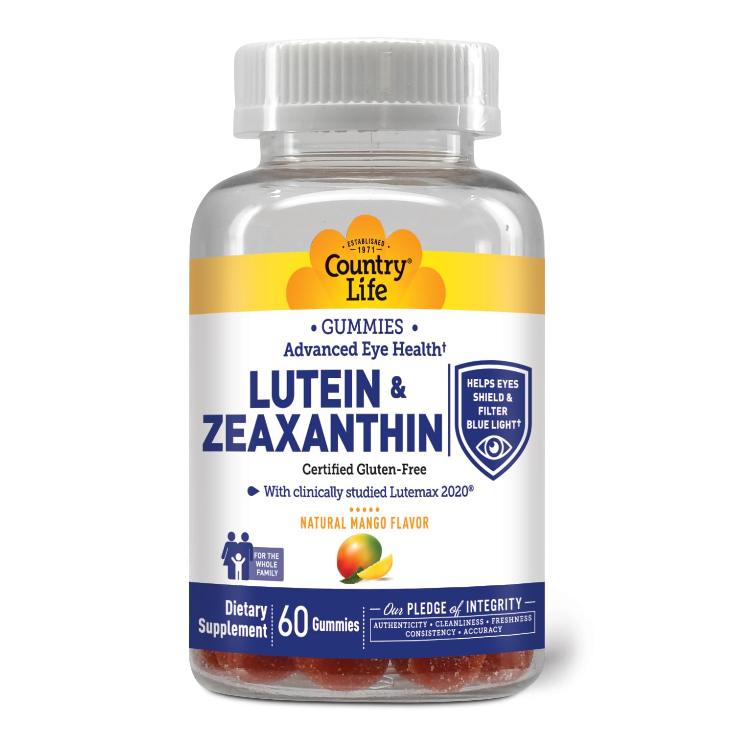 Country Life Integrity Promise Since 1971, we've been committed to clean, authentic nutrition backed by rigorous quality standards and transparency in every bottle. . Delicious Convenient Two tasty gummies per serving make it easy to incorporate powerful eye support into your routine—no pills or water required. . Natural Fruit Pectin Gummies Made with natural flavors and colors, these vegan gummies are gelatin-free, gluten-free, and Non-GMO for clean daily support. . Supports Macular Vision Health Provides all three key macular carotenoids to promote clear vision, healthy retina function, and overall eye wellness. . Advanced Eye Health Formula Formulated with clinically researched Lutemax 2020, delivering 20 mg of lutein and 4 mg of zeaxanthin isomers to help protect eyes against blue light and oxidative stress. .