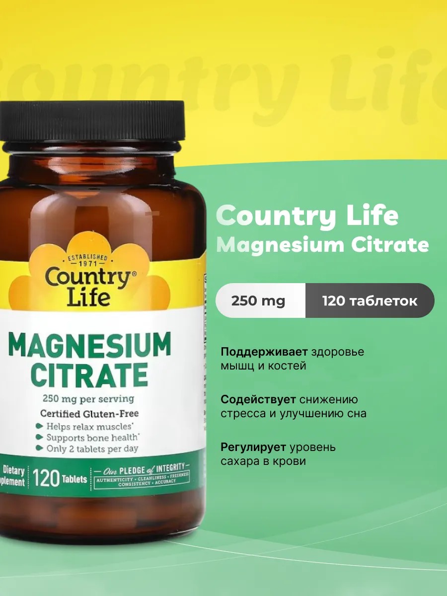 Country Life Magnesium Citrate — это высококачественная добавка, содержащая магний в легко усваиваемой форме цитрата магния. Магний является важным минералом, который участвует во множестве физиологических процессов в организме, включая поддержку здоровья мышц и нервной системы, регуляцию уровня сахара в крови и содействие синтезу белка. Эта добавка может помочь улучшить здоровье костей, снизить уровень стресса и способствовать более качественному сну.