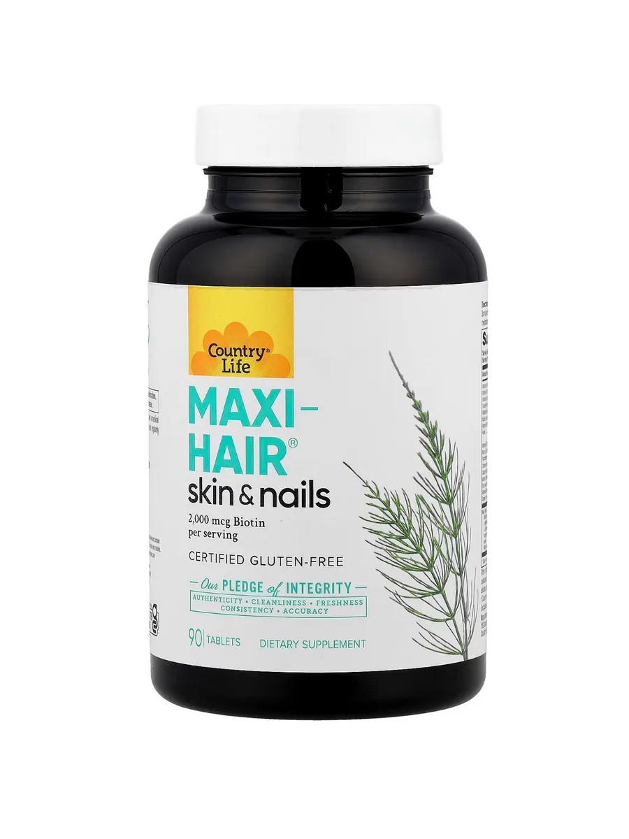Maxi-Hair от Country Life - это комплекс витаминов для поддержки роста и здоровья волос, ногтей, а также для красивой и здоровой кожи. Макси Хаир - это специально подобранная формула минералов и витаминов, которая необходима для нормального роста волос и общего здоровья ногтей и кожи.