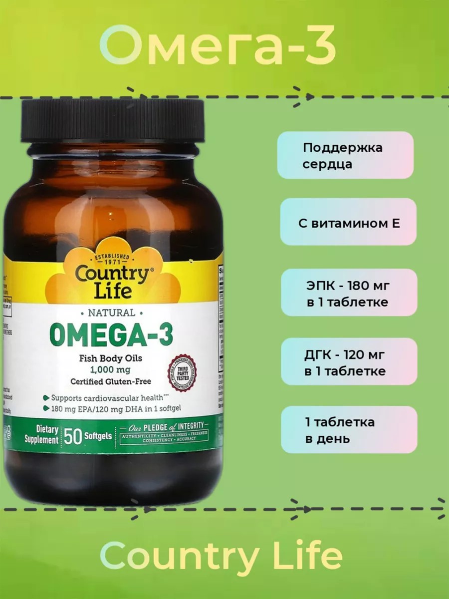 Рыбий жир из холодноводных рыб содержит омега-3 жирные кислоты. Омега-3 от Country Life содержит в общей сложности 1000 мг этих масел, включая 180 мг ЭПК и 120 мг ДГК всего в 1 капсуле. Потребление омега-3 жирных кислот поддерживает здоровье сердечно-сосудистой системы.