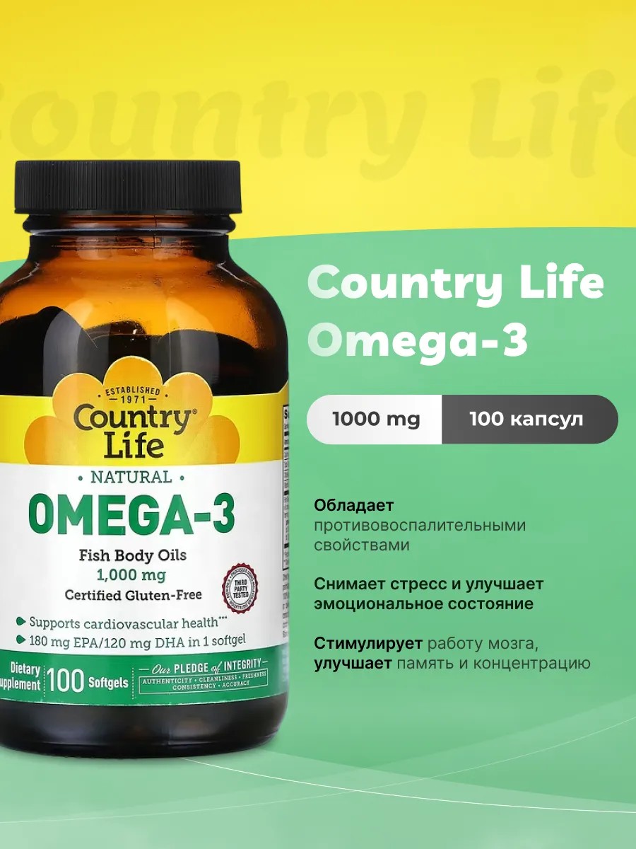 Country Life Omega-3 1000 mg - это бад, который содержит высококачественные омега-3 жирные кислоты, такие как эйкозапентаеновая кислота (EPA) и докозагексаеновая кислота (DHA). Омега-3 жирные кислоты являются важными компонентами для здоровья сердечно-сосудистой системы, мозга и глаз. Они помогают улучшить кровообращение, снизить уровень холестерина в крови и защитить сердце от различных заболеваний. Они также помогают улучшить функционирование мозга, повысить уровень энергии и улучшить зрение. Этот бад идеально подходит для людей, которые хотят улучшить свое здоровье сердечно-сосудистой системы, мозга и глаз, а также повысить свой уровень энергии и общее состояние здоровья. Однако, перед использованием этого бада, необходимо проконсультироваться с врачом, особенно если вы принимаете какие-либо лекарства.