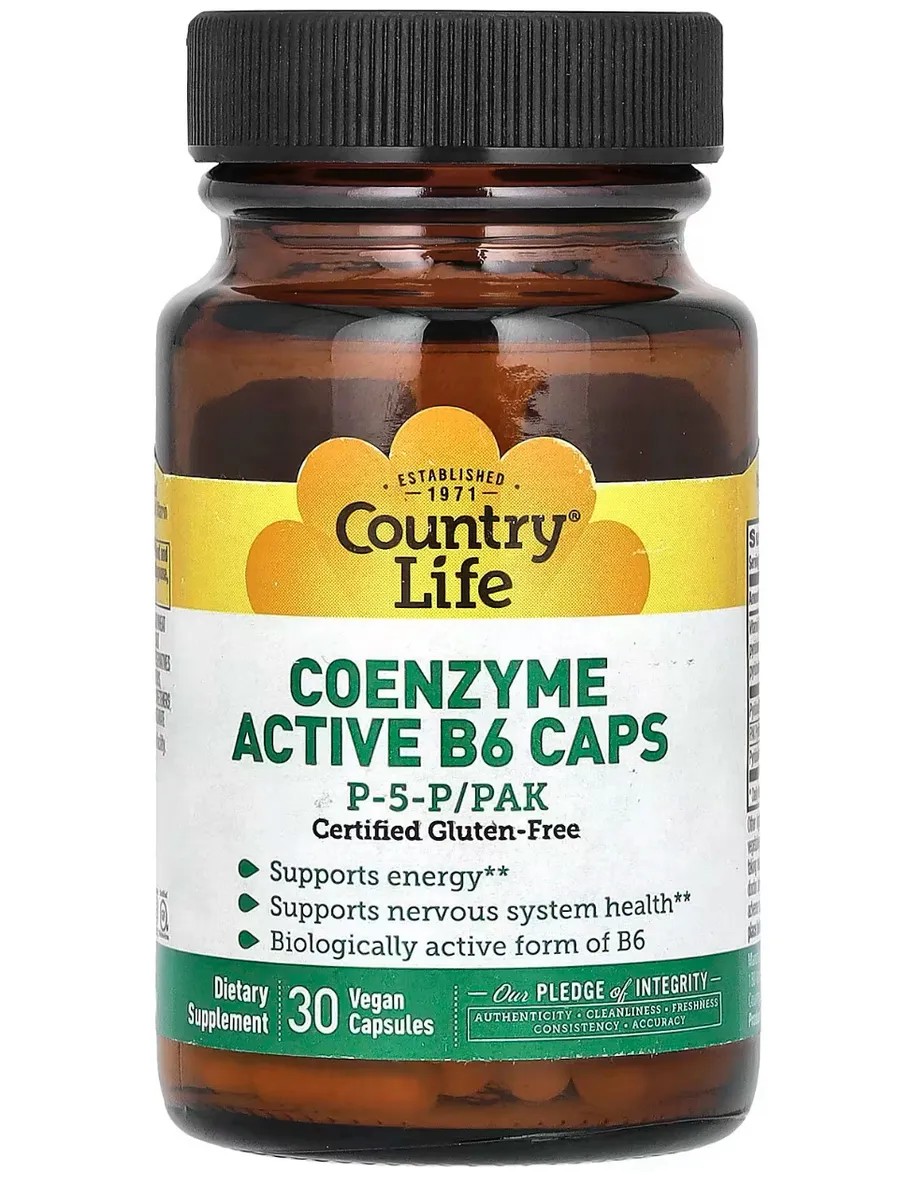 Country Life, коферментный активный витамин B6 в капсулах, P-5-P/PAK, 30 вегетарианских капсул Количество в 1 порции % от суточной нормы