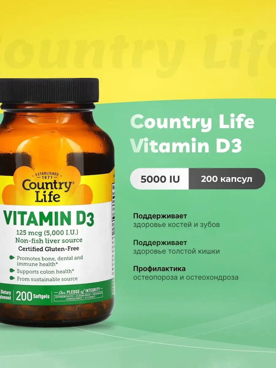 Country Life Vitamin D3 5000 IU - это высококачественный диетический добавок, содержащий витамин D3, необходимый для поддержания здоровья костей и иммунной системы. Каждая капсула содержит 5000 МЕ (международных единиц) витамина D3, который является биологически активной формой витамина D. Этот продукт производится из натуральных источников и не содержит глютена, сои, молочных продуктов, искусственных красителей, ароматизаторов и консервантов. С помощью Country Life Vitamin D3 5000 IU вы можете поддерживать здоровье костей, укреплять иммунную систему и повышать уровень энергии и жизненной активности.