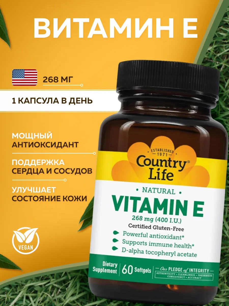 D-альфа-токоферол: Country Life использует натуральную форму витамина Е (вместо синтетического dl-альфа-токоферола), которая лучше усваивается.