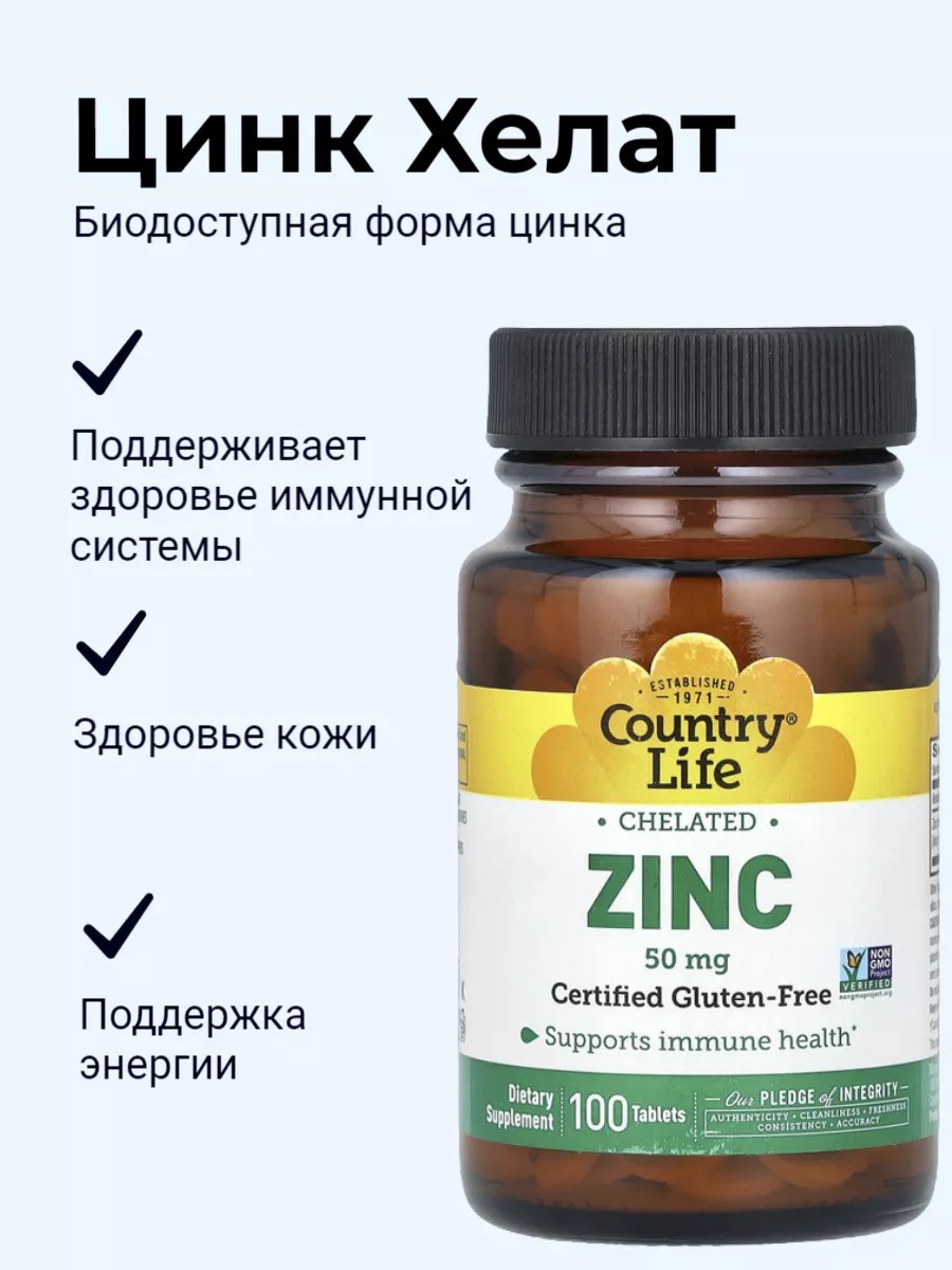 Country Life Цинк Хелат, Zinc Chelated, 50 мг, 100 таблеток
