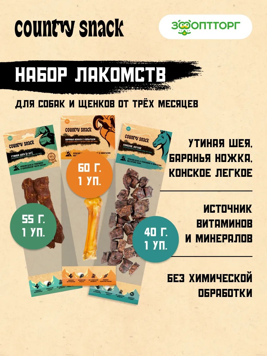 Лакомства для собак и щенков Country Snaсk – это натуральное и полезное угощение для питомцев в возрасте от 3 месяцев. Набор утиная шея, баранья ножка с копытцем и конское легкое – это лакомства, содержащие большое количество полезных веществ, минералов и микроэлементов. Помогают укрепить мышцы и суставы, поддерживают здоровье и уровень активности вашего питомца. Послужат отличным развлечением, вознаграждением и способом отвлечь от нежелательных предметов. Не подвергаются химической обработке и не содержат искусственных красителей, ароматизаторов или наполнителей, что делает их полезными и полностью безопасными. Плотная текстура лакомств помогает чистить зубы, снимая налёт и предотвращая появление зубного камня, что является важной частью ухода за полостью рта собаки.