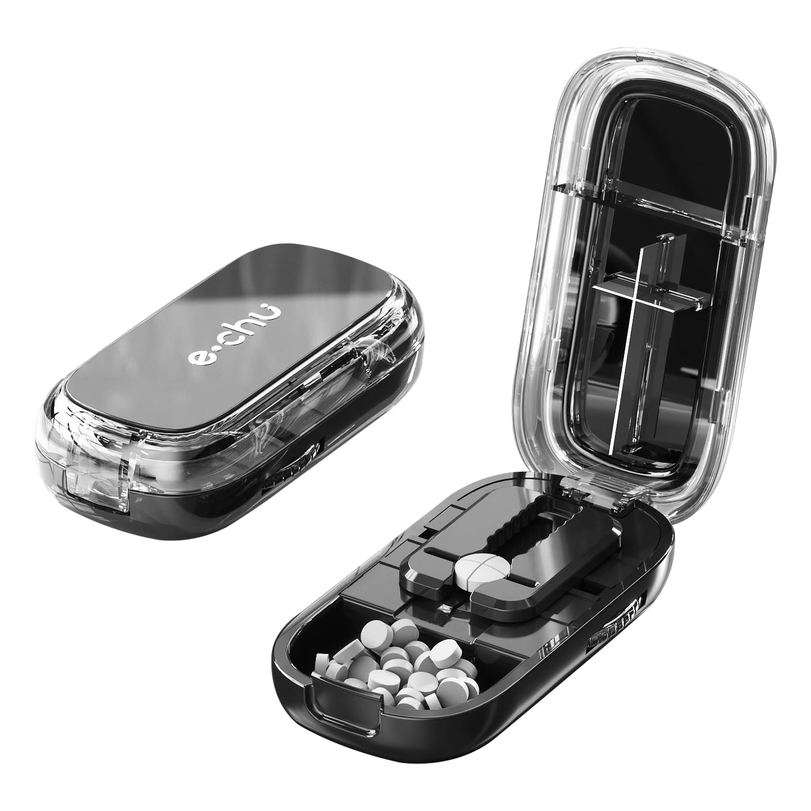 Solve the hassle --- Pills are often too large, making them difficult for the elderly and children to swallow. They are easier to take after being cut (also suitable for dogs and cats who take half a pill). Too many pills are cumbersome to carry, so it's convenient to keep them in a pill organizer. Small and portable --- The pill cutter is about the size of a palm and has a compact design. You can carry it with you and easily put it in your bag. It's easy to store and doesn't take up much space. It's perfect for leisure, business, travel, the office, and everyday use. Multifunctional swallowing aid Innovative 2-in-1 function: Place the pill on the edge and it can be cut in half. Place the pill in the middle and it can be cut into quarters. The bottom section is wide and can also be used as a pill organizer to store more medication. Safe to use The blade on top of the pill cutter is concealed. When using, press down on the top to lower the blade for cutting. You can therefore use it with confidence. High-quality materials --- Part of the box is made of food-grade ABS material, which is safe for direct contact with medication. The stainless steel blade is wear-resistant and corrosion-resistant, providing a precise, sharp, and clean cut.