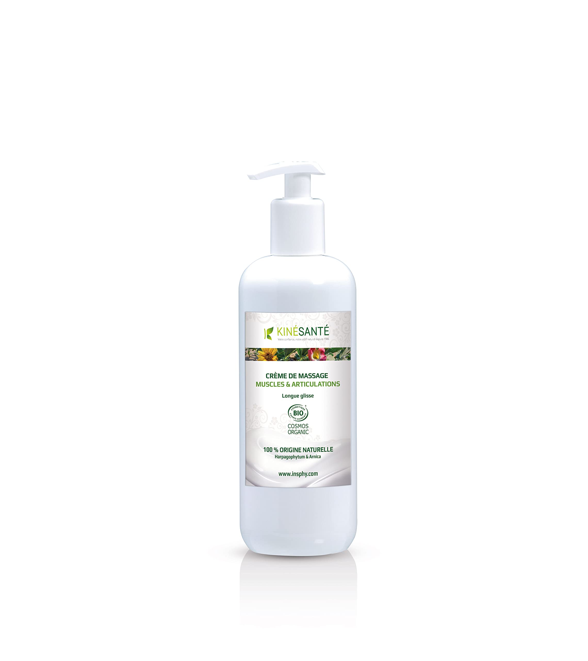 : KINESANTE Harpagophytum Arnica Muscle Joint Cream is COSMOS ORGANIC certified. This professional massage cream is designed for the care of joints and muscles. It is highly concentrated in active plant ingredients: arnica, harpagophytum, and organic, chemotyped essential oils of camphor rosemary, lavandin abrial, and sweet orange. Its supple, non-greasy texture allows for prolonged and deep massages. The massage time is determined by the amount of cream used. Harpagophytum is the ultimate plant for joints, complemented by the well-known soothing and decongestant properties of arnica. Ingredients: Aqua, Cocos Nucifera Oil , Helianthus Annuus Hybrid Oil , Alcohol , Cetearyl Olivate, Theobroma Cacao Seed Butter , Sorbitan Olivate, Harpagophytum Procumbens Root Extract , Arnica Montana Flower Extract , Rosmarinus Officinalis Leaf Oil , Lavandula Hybrida Abrial Herb Oil , Citrus Aurantium Dulcis Peel Oil Expressed , Xanthan Gum, Helianthus Annuus Seed Oil, Tocopherol, Citric Acid, Limonene, Linalool, Geraniol, Citral, Coumarin. From organic farming. Processed from organic ingredients. 44.37 of the total ingredients are from organic farming. 100 of the total ingredients are of natural origin. COSMOS ORGANIC Certified by Cosmécert according to the COSMOS standard. This product is labeled "Cruelty-free vegan." KINÉSANTÉ is the professional range from Laboratoire INSPHY, a French laboratory that has designed and manufactured parapharmaceutical skincare products since 1986. Instructions for use: 1. Apply the cream to the muscle and joint areas. 2. Gently massage the areas for 10 to 60 minutes. Safety Warning: Perform a patch test before use. For external use only. Keep out of reach of children. See moreMade in France, in the South of France. Contains mother tinctures of arnica and devil's claw, and organic, chemotyped essential oils of camphor rosemary, lavandin abrial, and sweet orange. No listed preservatives or parabens, naturally preserved. For massages lasting 10 to 60 minutes. Professional, long-lasting cream. Specifically formulated for joints and muscles.Description du produit La Crème Muscles Articulations Harpago Arnica KINESANTE est certifiée COSMOS ORGANIC, C'est une crème de massage professionnelle pour la prise en charge des articulations et des muscles. C'est une crème très concentrée en principes actifs végétaux : arnica, harpagophytum, et en huiles essentielles bio, chémotypées de romarin à camphre, lavandin abrial et orange douce. De texture souple et non grasse, elle permet de prodiguer des massages prolongés et profonds. Le temps de massage est déterminé par la quantité de crème utilisée. L'harpagophytum est la plante souveraine des articulations, complétée avec les propriétés apaisantes et décongestionnantes bien connues de l'arnica. Ingrédients : Aqua, Cocos Nucifera Oil , Helianthus Annuus Hybrid Oil , Alcohol , Cetearyl Olivate, Theobroma Cacao Seed Butter , Sorbitan Olivate, Harpagophytum Procumbens Root Extract , Arnica Montana Flower Extract , Rosmarinus Officinalis Leaf Oil , Lavandula Hybrida Abrial Herb Oil , Citrus Aurantium Dulcis Peel Oil Expressed , Xanthan Gum, Helianthus Annuus Seed Oil, Tocopherol, Citric Acid, Limonene, Linalool, Geraniol, Citral, Coumarin. Issu de l'agriculture biologique. Transformé à partir d'ingrédients biologiques. 44.37 du total des ingrédients sont issus de l'Agriculture Biologique. 100 du total des ingrédients sont d'origine naturelle. COSMOS ORGANIC Certifié par Cosmécert selon le référentiel COSMOS. Ce produit est labélisé "Cruelty free vegan" KINÉSANTÉ est la gamme professionnelle du Laboratoire INSPHY, laboratoire français, concepteur et fabricant de produits de soins parapharmaceutiques depuis 1986. Mode d'emploi 1. Appliquer la crème sur les zones musculaires et articulaires. 2. Masser délicatement les zones pendant 10 à 60 minutes. P.when('A').execute(function(A) { A.on('a:expander:toggle_description:toggle:collapse', function(data) { window.scroll(0, data.expander. expander[0].offsetTop-100) }) }) Avertissement De Sûreté Effectuer un test de tolérance avant utilisation. Réservé à l'utilisation externe. Tenir hors de portée des enfants. Voir plusFabrication française, dans le Sud de la France. Contient des teintures mères d'arnica, d'harpagophytum, et des huiles essentielles bio et chémotypées de romarin à camphre, de lavandin abrial et orange douce. Sans conservateur listé et sans parabène, conservation naturelle. Massages de 10 à 60 minutes. Crème professionnelle très longue glisse. Crème spécifique des articulations et des muscles.Crème Muscles Articulations Harpago Arnica 500 ml