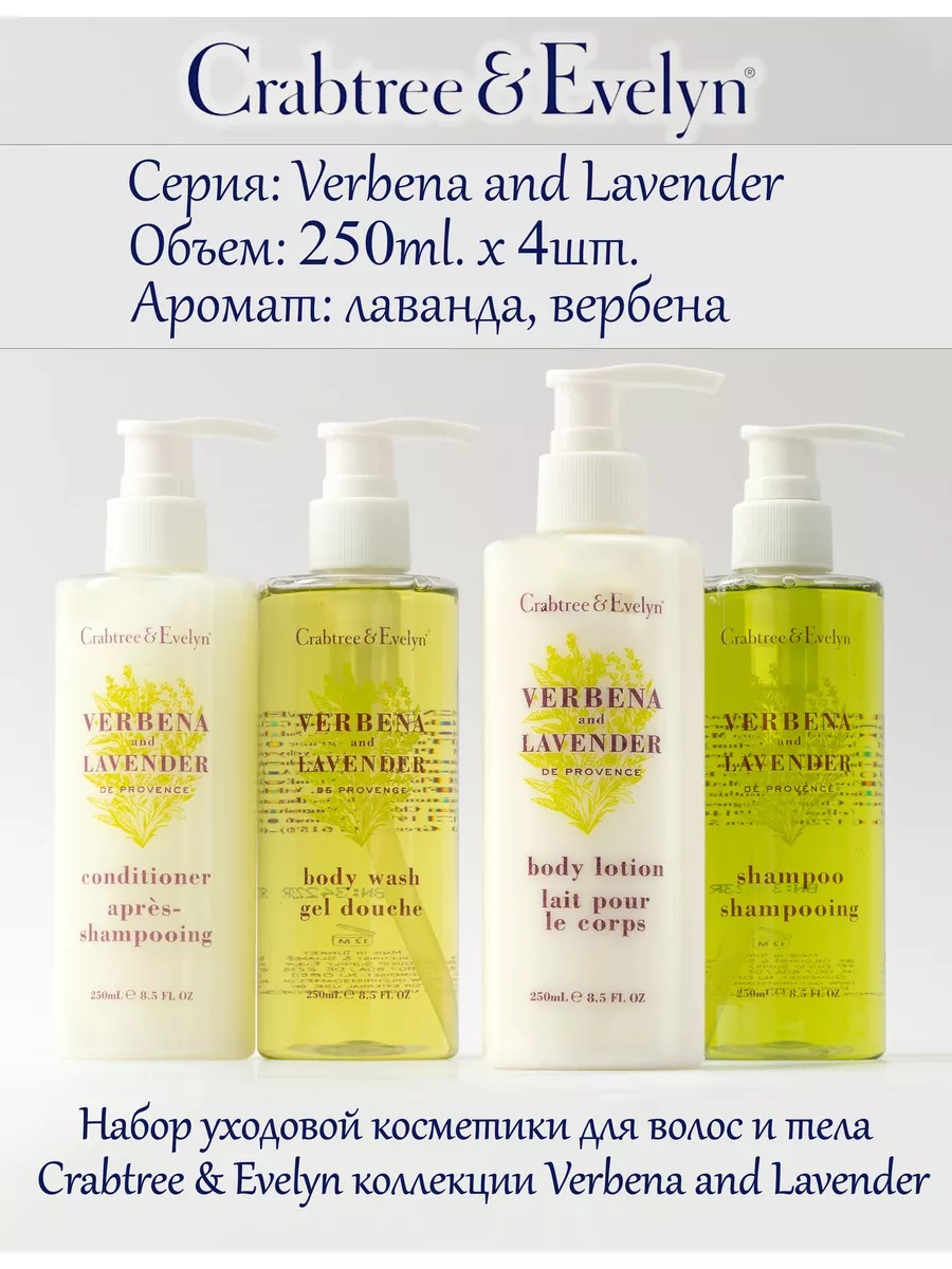 В составе набора из коллекции Crabtree & Evelyn коллекции Verbena and Lavender: Шампунь для волос (250ml.), Кондиционер для волос (250ml.), Гель для душа (250ml.), Лосьон для тела (250ml.).