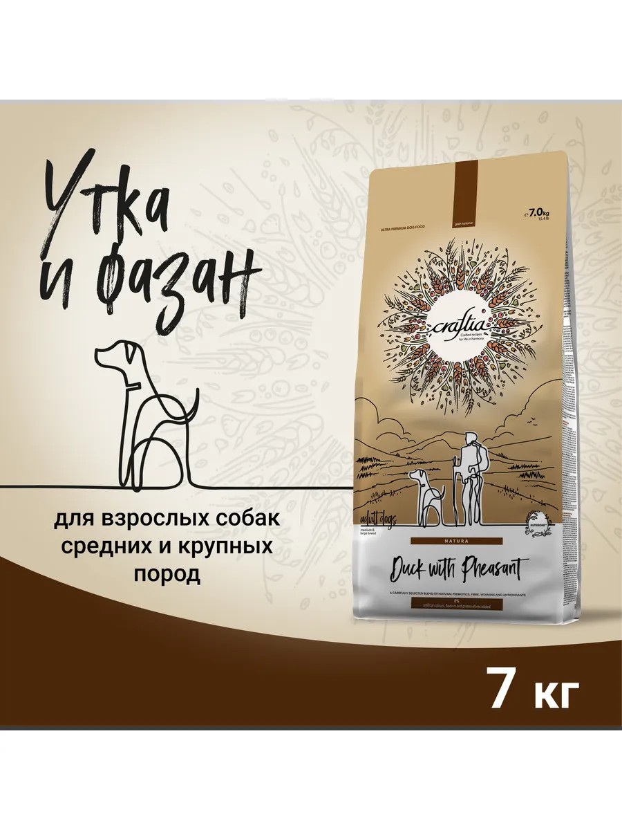 | Полное наименование товара | Сухой корм CRAFTIA NATURA для взрослых собак средних и крупных пород из утки с фазаном 7 кг |
