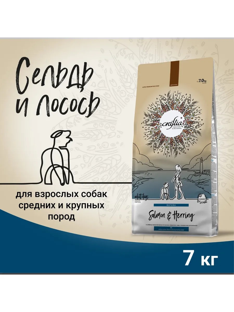 | Полное наименование товара | Сухой корм CRAFTIA NATURA для взрослых собак средних и крупных пород из лосося и сельди 7 кг |
