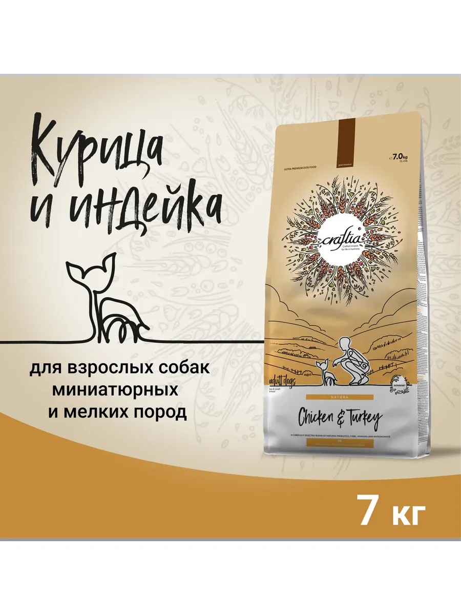 | Полное наименование товара | Сухой корм CRAFTIA NATURA для взрослых собак миниатюрных и мелких пород из курицы и индейки 7 кг |