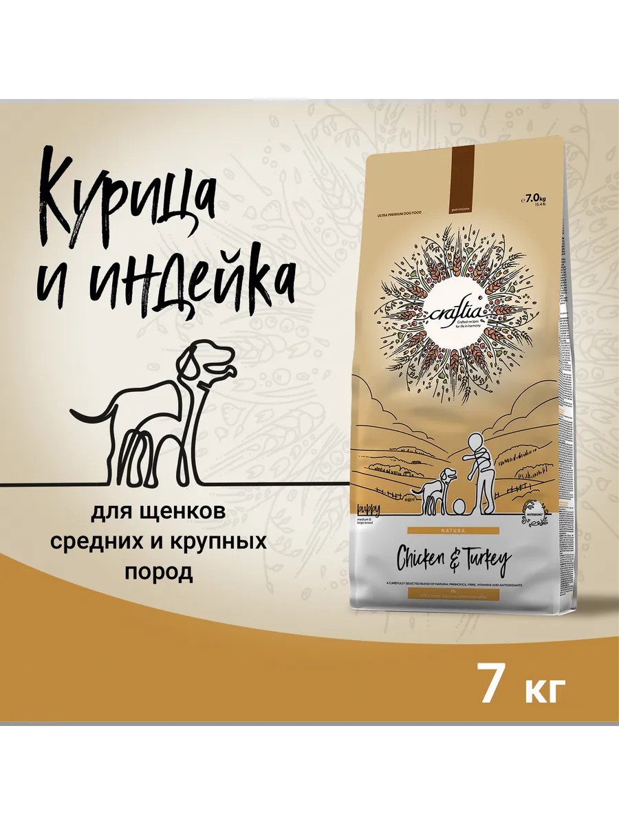| Полное наименование товара | Сухой корм CRAFTIA NATURA для щенков средних и крупных пород из курицы и индейки 7 кг |