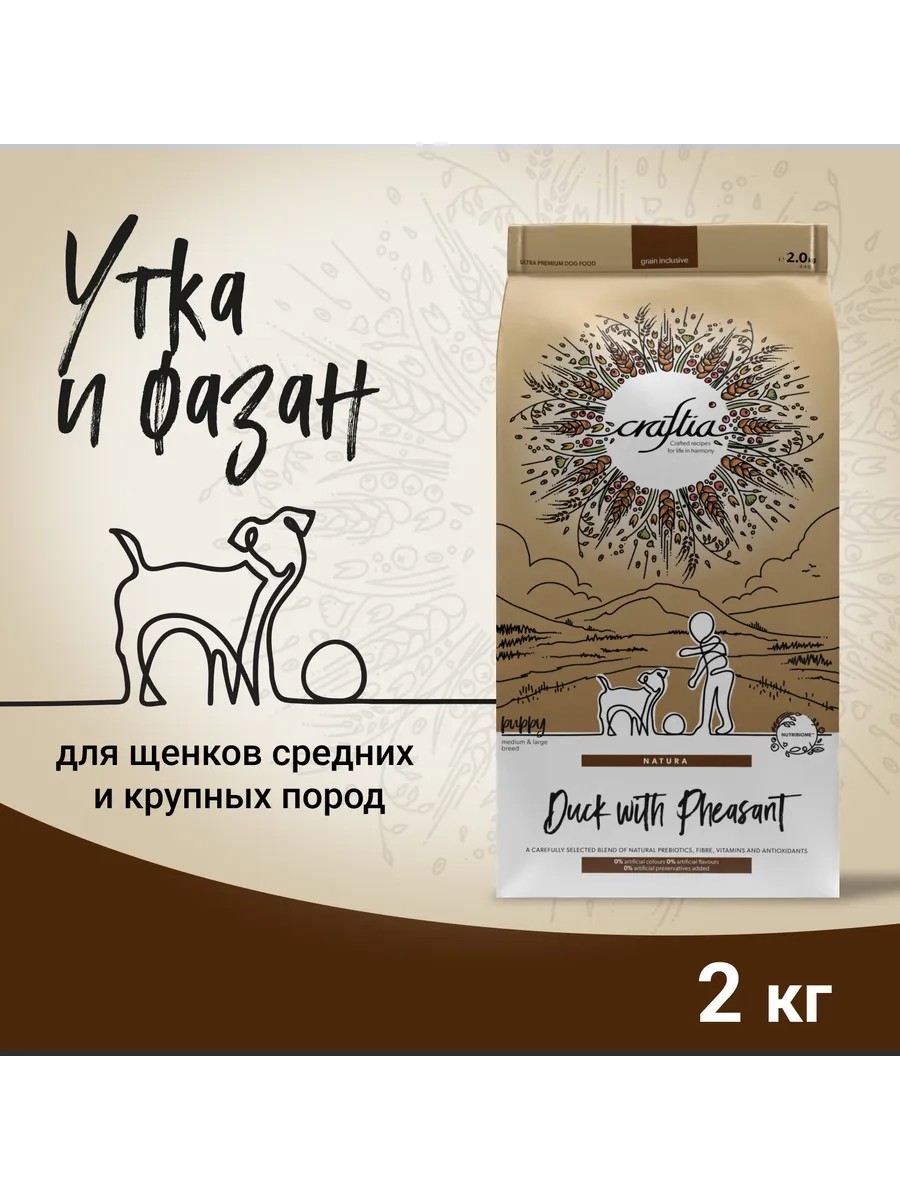| Полное наименование товара | Сухой корм CRAFTIA NATURA для щенков средних и крупных пород из утки с фазаном 2 кг |