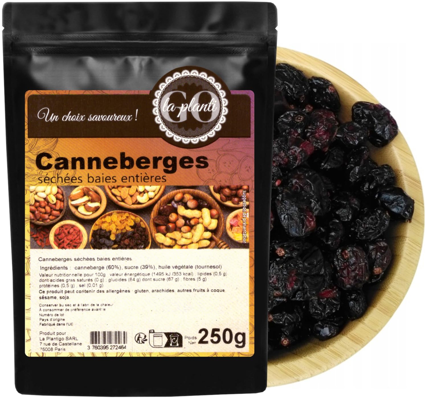 Ingredients: Cranberries (60 ), sugar, sunflower oil (max. 1 ). Cane sugar and sunflower oil are added to preserve the natural properties of the cranberries. Our product does not contain any chemical preservatives. Nutritional values per 100g of cranberries: Energy – 1288 kJ 308 kcal Fat – 1.1g of which saturates – 0.08g Carbohydrate – 83g of which sugars – 73g Fiber – 5.3g Protein – 0.17g Salt – 0.01g Nutritional values were calculated from raw material databases and specifications. Individual batches may vary slightly. Allergen Information: This product may contain the following allergens: gluten, peanuts, tree nuts, sesame, soy. Packaging: The product is packaged in thick doypack-type pouches. The packaging has a welded cord closure, allowing for easy opening and resealing multiple times. Thanks to this simple technology, the product retains its freshness. Its organoleptic properties remain unchanged throughout its shelf life. Thanks to high sales volumes and our stock turnover, LA PLANTIGO products are always fresh, encouraging bulk purchases and stocking up on food in the home pantry. Ingredients: cranberries (60 ), sugar, sunflower oil (max. 1 )Cane sugar and sunflower oil are added to preserve the natural properties of the cranberries. Our product contains no chemical preservatives. Ingredients: cranberries (60 ), sugar, sunflower oil (max. 1 ). Dried whole cranberries have won over many fans in the culinary world. Their shape is reminiscent of raisins, but they are larger and plumper. These dried whole cranberries have a sweet and tangy flavor and are characterized by a juicy, intense color.Description du produit Ingrédients : cranberries (60 ), sucre, huile de tournesol (max. 1 ). Le sucre de canne et l'huile de tournesol sont ajoutés afin de conserver les propriétés naturelles des cranberries. Notre produit ne contient pas de substances chimiques de conservation. Valeurs nutritionnelles pour 100 g de cranberries: Valeur énergétique – 1288 kJ 308 kcal Lipides – 1,1 g Dont acides gras saturés - 0,08 g Glucides – 83 g Dont sucres - 73 g Fibres – 5,3 g Protéines – 0,17 g Sel – 0,01 g Les valeurs nutritionnelles ont été calculées à partir de base de données et spécifications de matières premières. Les lots individuels peuvent varier légèrement. Information sur allergènes : Ce produit peut contenir les allergènes : gluten, arachides, fruit à coque, sésame, soja. Méthode d'emballage : Le produit est emballé dans des sachets épais de type « doypack ». L'emballage a une fermeture à cordon soudé, ce qui permet l'ouverture et la fermeture facile plusieurs fois. Grâce à cette technologie simple le produit garde sa fraicheur. Ses propriétés organoleptiques ne changent pas pendant toute la durée de conservation. Grâce aux volumes de ventes important et la rotation de nos stocks, les produits LA PLANTIGO sont toujours frais, ce qui favorise les achats en gros et le stockage des aliments dans le garde-manger à la maison. Ingrédients cranberries (60 ), sucre, huile de tournesol (max. 1 )Le sucre de canne et l'huile de tournesol sont ajoutés afin de conserver les propriétés naturelles des cranberries. Notre produit ne contient pas de substances chimiques de conservation. Ingrédients : cranberries (60 ), sucre, huile de tournesol (max. 1 ). Les cranberries entières séchées ont conquis de nombreux adeptes dans le monde de la cuisine. Leur forme rappelle celle des raisins secs. Cependant, ils sont plus grands et plus charnus. Les fruits entiers séchés de cranberries au goût acidulé et sucré se caractérisent par une teinte juteuse et intense.Cranberries séchées baies entières 250 g- LA PLANTIGO