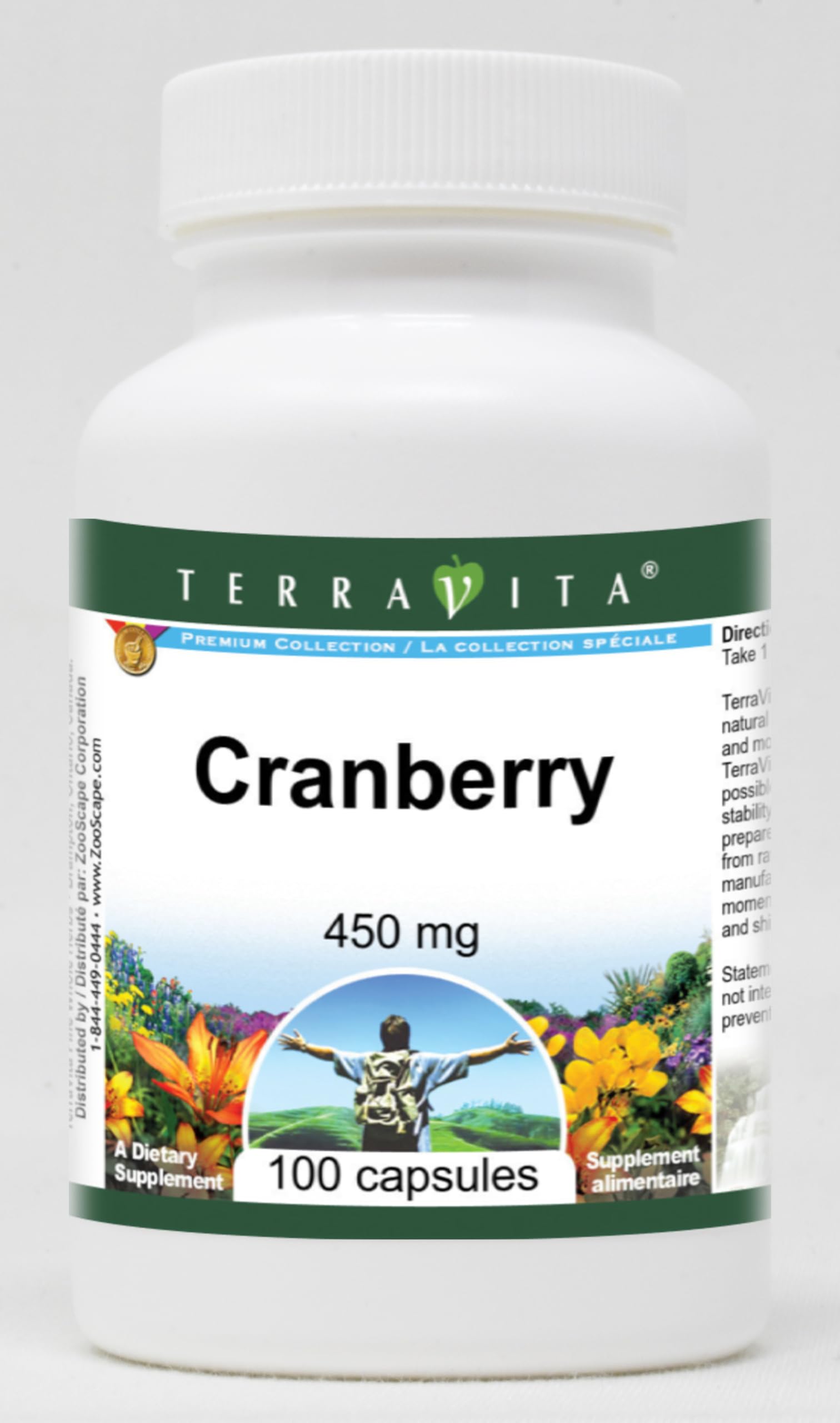 Cranberry - 450 mg (100 capsules, ZIN: 519899) Packaged in the United States in a GMP certified facility (Good Manufacturing Practice). No fillers. Manufacturer: TerraVita Size: 100 capsules Easy-to-swallow Capsules in a sealed bottle. Ingredients: Gelatin, Water, Cranberry - 450 mg
