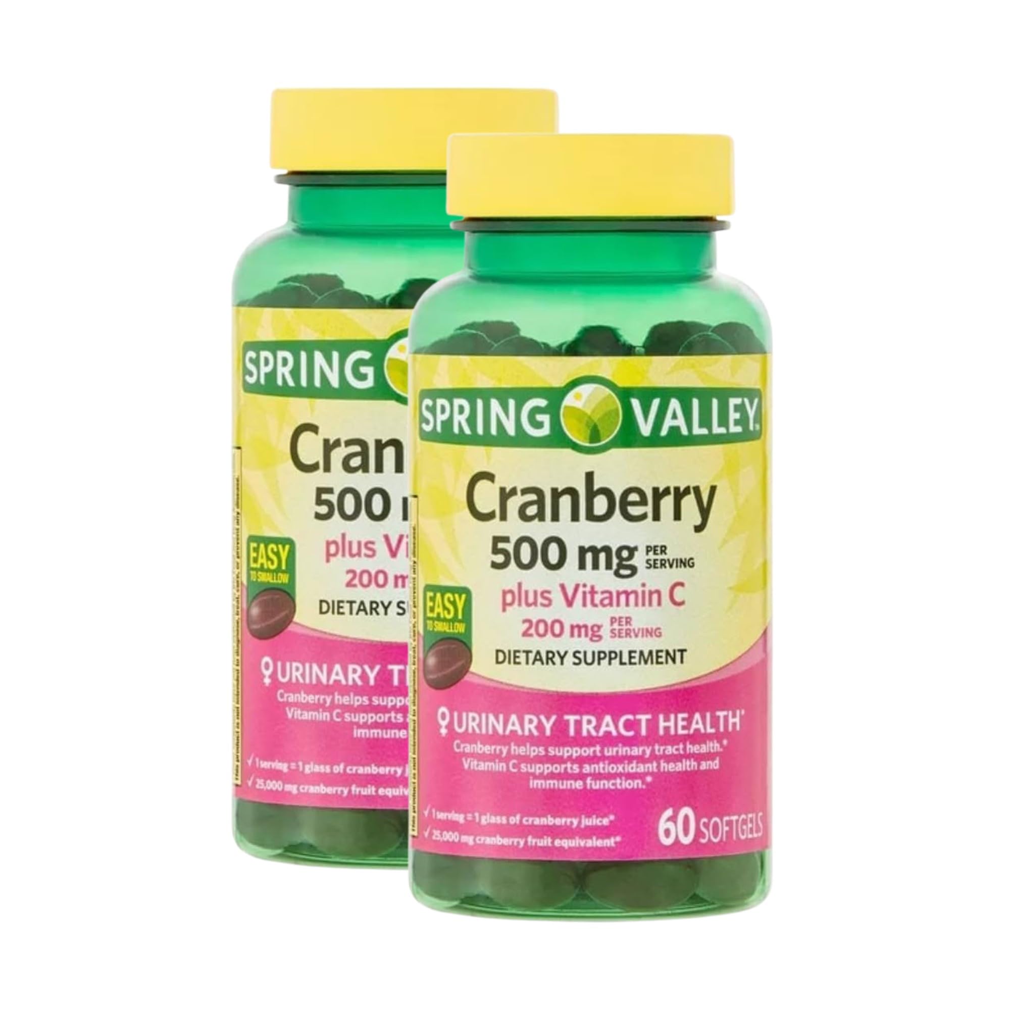 Cranberry 500mg Softgels with Vitamin C Pack of 2 offer a simple and effective way to support your daily wellness. Each serving provides 500mg of cranberry extract along with 200mg of vitamin C, giving you the fruit equivalent of 25,000mg of fresh cranberry in two easy-to-swallow softgels. These cranberry supplements for women are formulated without artificial colors, preservatives, sweeteners, soy, peanuts, gluten, or dairy. Whether you're looking for cranberry softgels, cranberry extract softgels , or a more convenient alternative to cranberry juice, this product fits easily into your daily routine. Known for its antioxidant content and natural support, cranberry vitamins with added vitamin C help you maintain a balanced and consistent approach to wellness. This supplement provides a clean, concentrated source of cranberry without the sugar or calories found in juice or gummies. 500mg Cranberry 200mg Vitamin C: Two softgels equal one glass of cranberry juice. 25,000mg Fruit Equivalent: High-potency formula in a convenient daily serving. Clean and Simple Formula: No gluten, soy, dairy, preservatives, or artificial ingredients. Easy to Swallow Softgels: Designed for everyday comfort and ease of use. Incorporate cranberry pills for women into your wellness routine with this high-quality, easy-to-take supplement that brings together the benefits of cranberry extract and vitamin C in one convenient formula.Daily Cranberry Vitamins – With 60 softgels per bottle, this cranberry supplement offers a one-month supply of cranberry extract 500mg for consistent use in your wellness routine. Clean Cranberry Supplement – Made without gluten, soy, peanuts, dairy, preservatives, artificial flavors, artificial colors, sweeteners, or high fructose corn syrup. Cranberry Pills for Women and Men – Designed for daily routines, these softgels are easy to swallow and a reliable choice for people searching cranberry pills, organic cranberry pills, or cranberry tablets. Equivalent to 1 Glass of Cranberry Juice – Delivers 25,000 mg cranberry fruit equivalent per serving in convenient softgels, making it a popular option for those looking for cranberry extract or cranberries supplement. Cranberry 500mg with Vitamin C – Each serving provides 500 mg cranberry plus 200 mg vitamin C, often searched as cranberry pills for women, cranberry supplements, and cranberry vitamins.