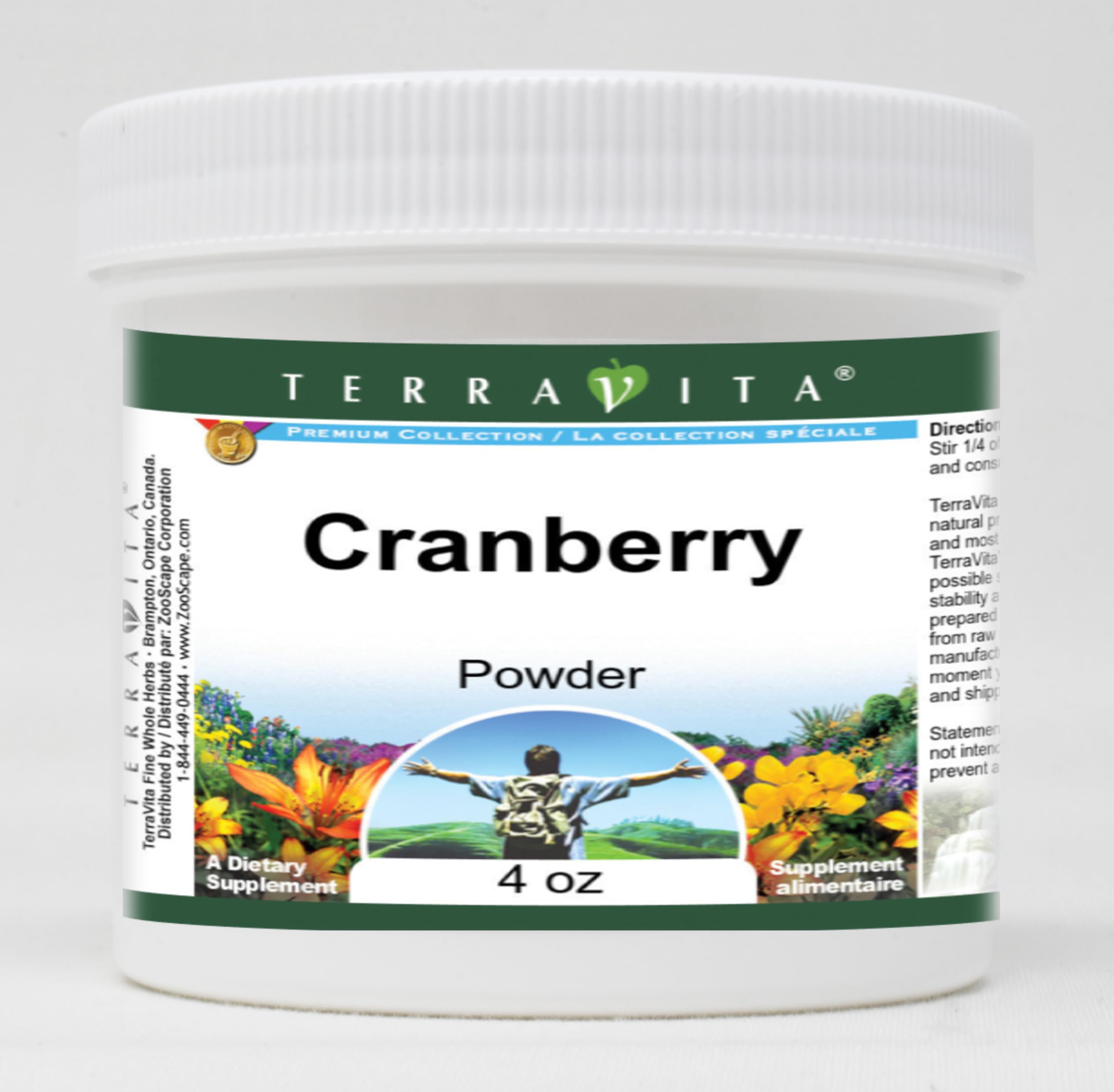 Convenient Powder format. Size: 4 oz. Manufacturer: TerraVita. No fillers. Cranberry Powder (4 oz, ZIN: 519901).
