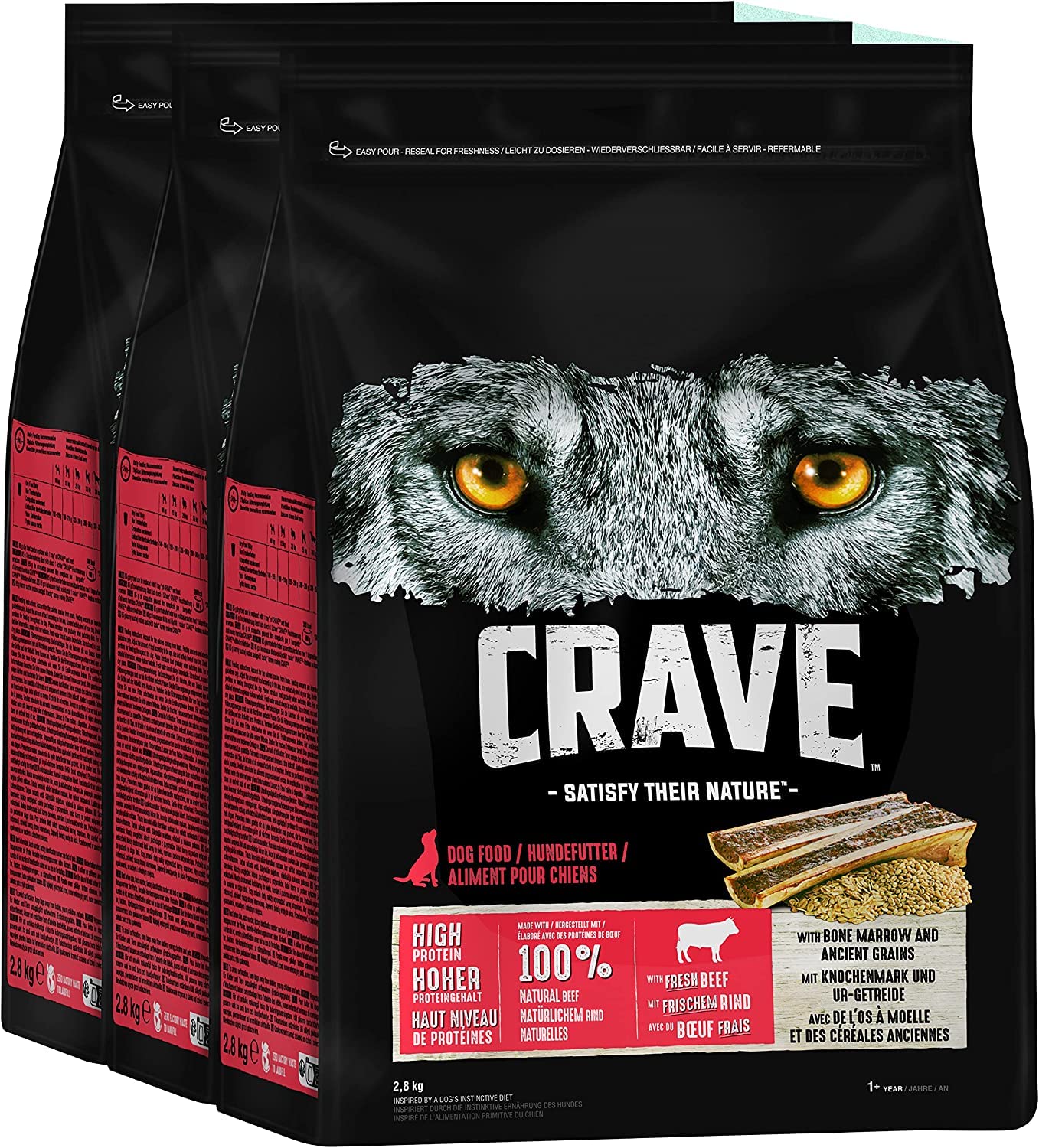 Crave Premium Trockenfutter Rind mit Knochenmark und Urgetreide für Hunde – Getreidefreies Adult Hundefutter mit hohem Proteingehalt – 3 x 2,8 kg Rind 2.8 kg (3er Pack)